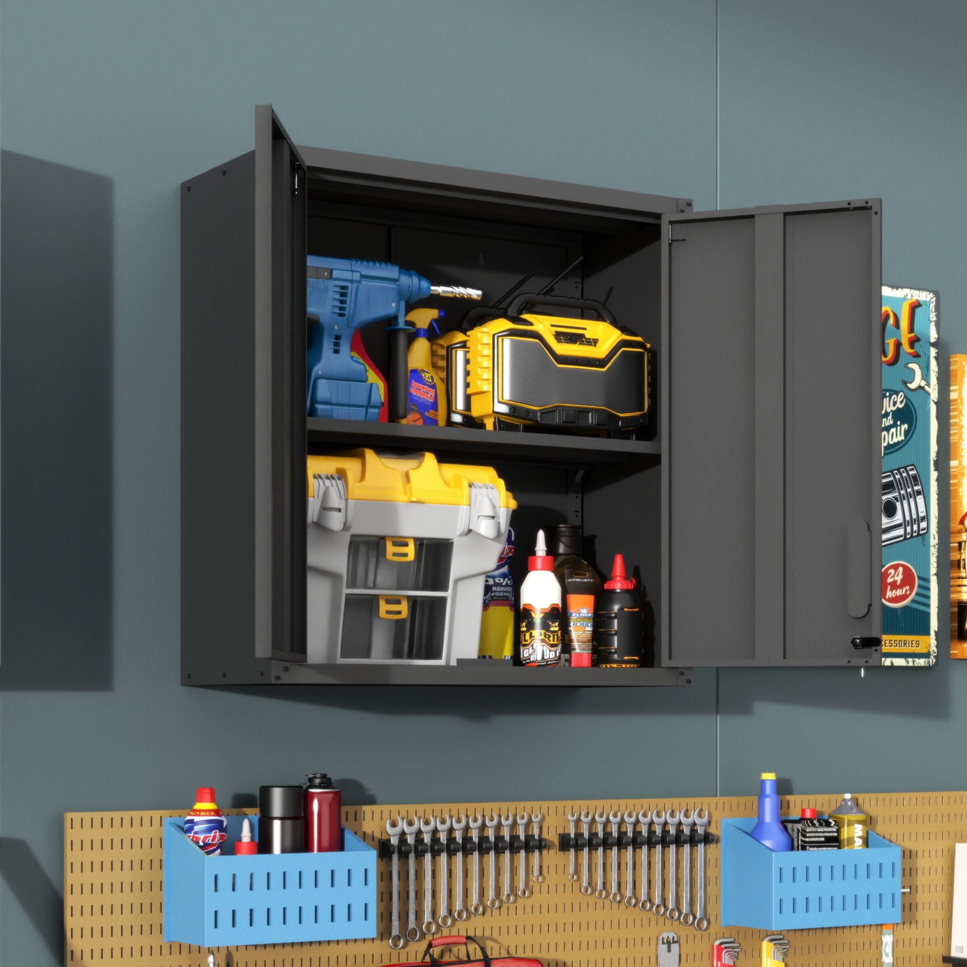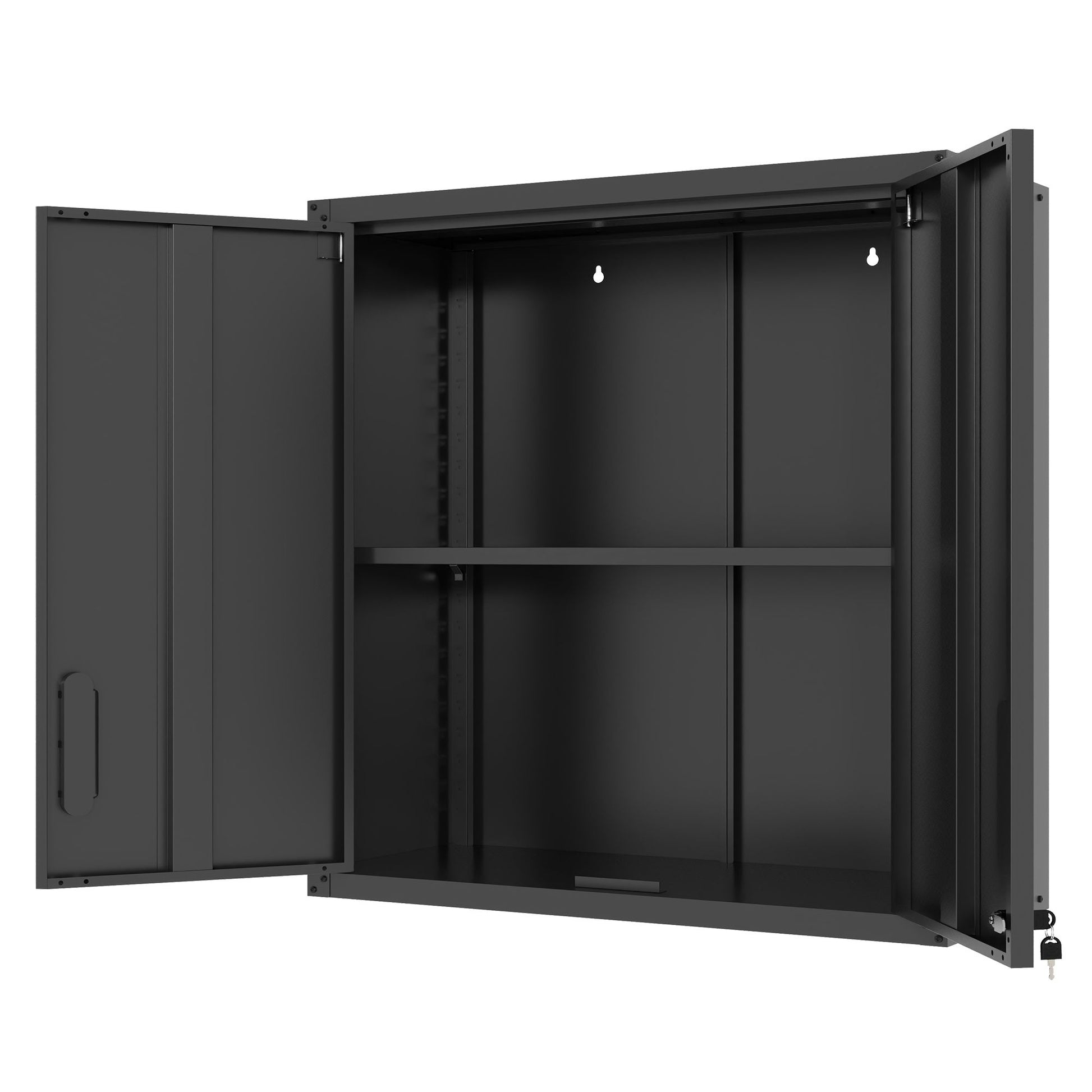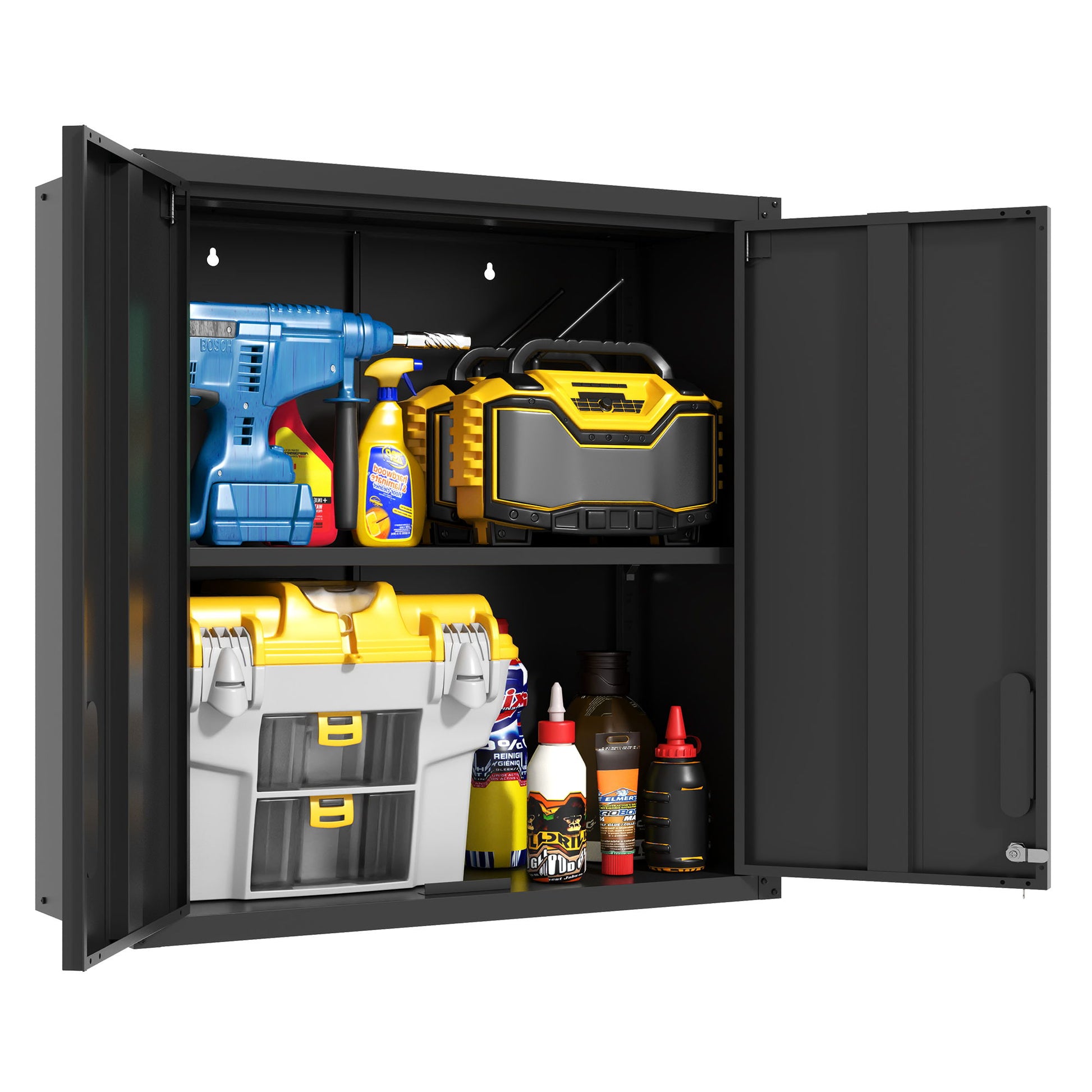 Metal Wall Mounted Tool Storage Cabinet With 2 Locking Doors, Adjustable Shelf, And Drawer - Black