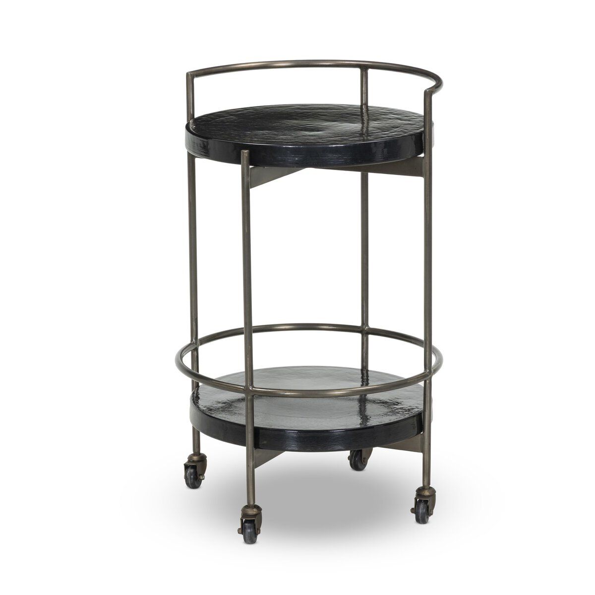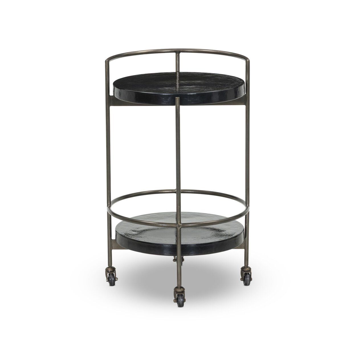- Round bar cart design with a sculptural, modern profile