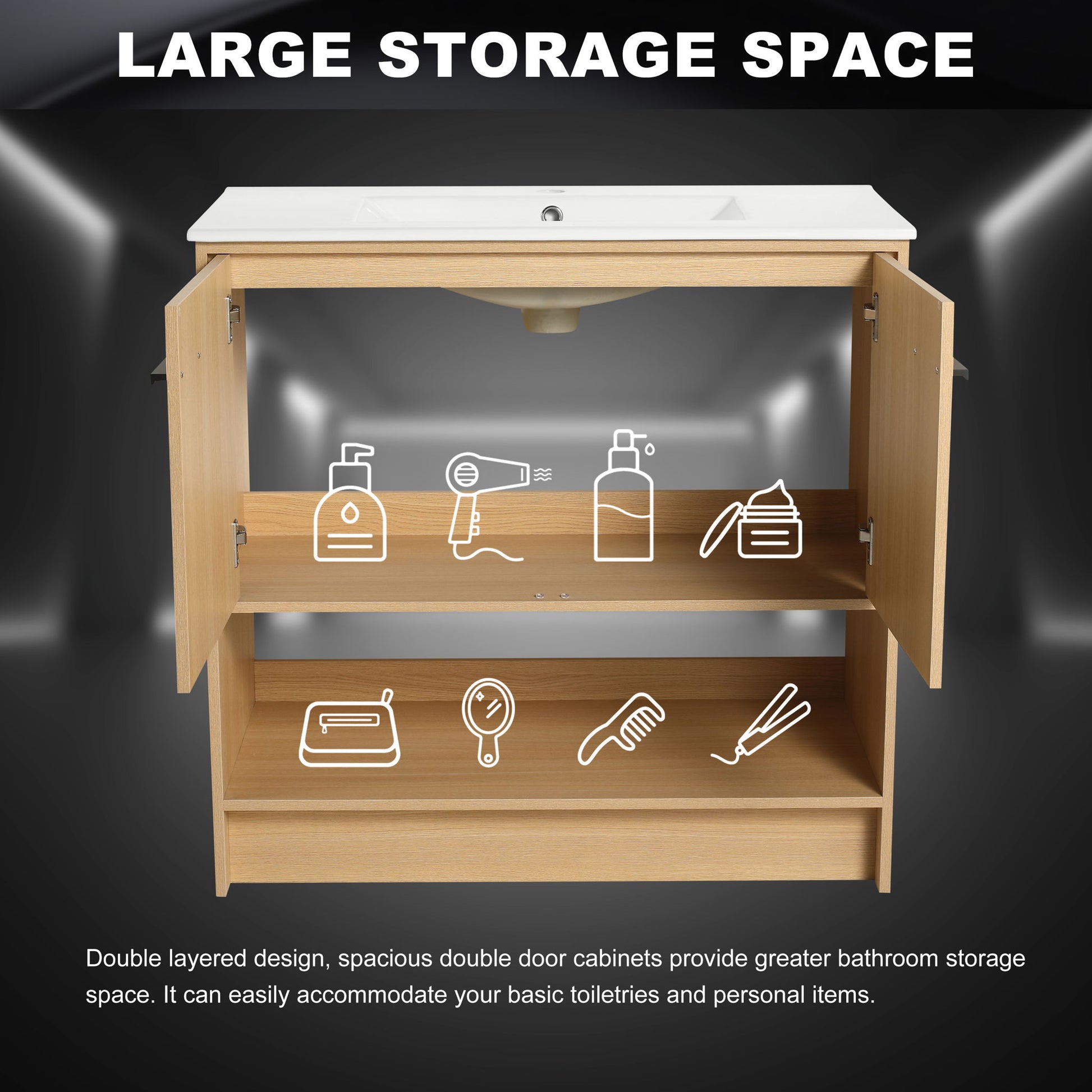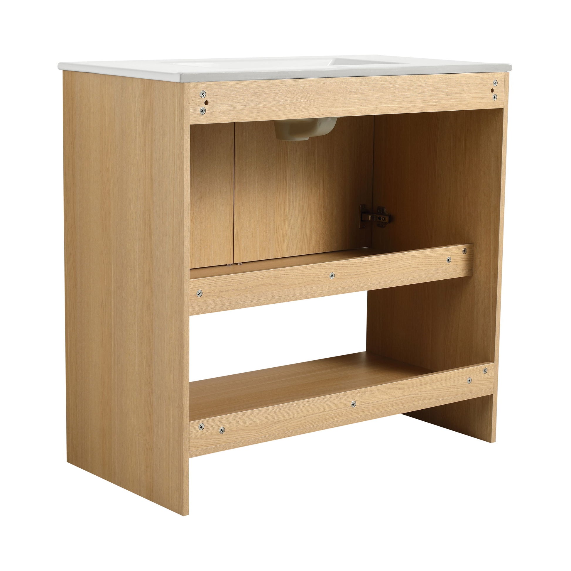 Modern 30" Bathroom Vanity With Ceramic Sink, Freestanding Cabinet, 2 Soft Closing Doors - Oak