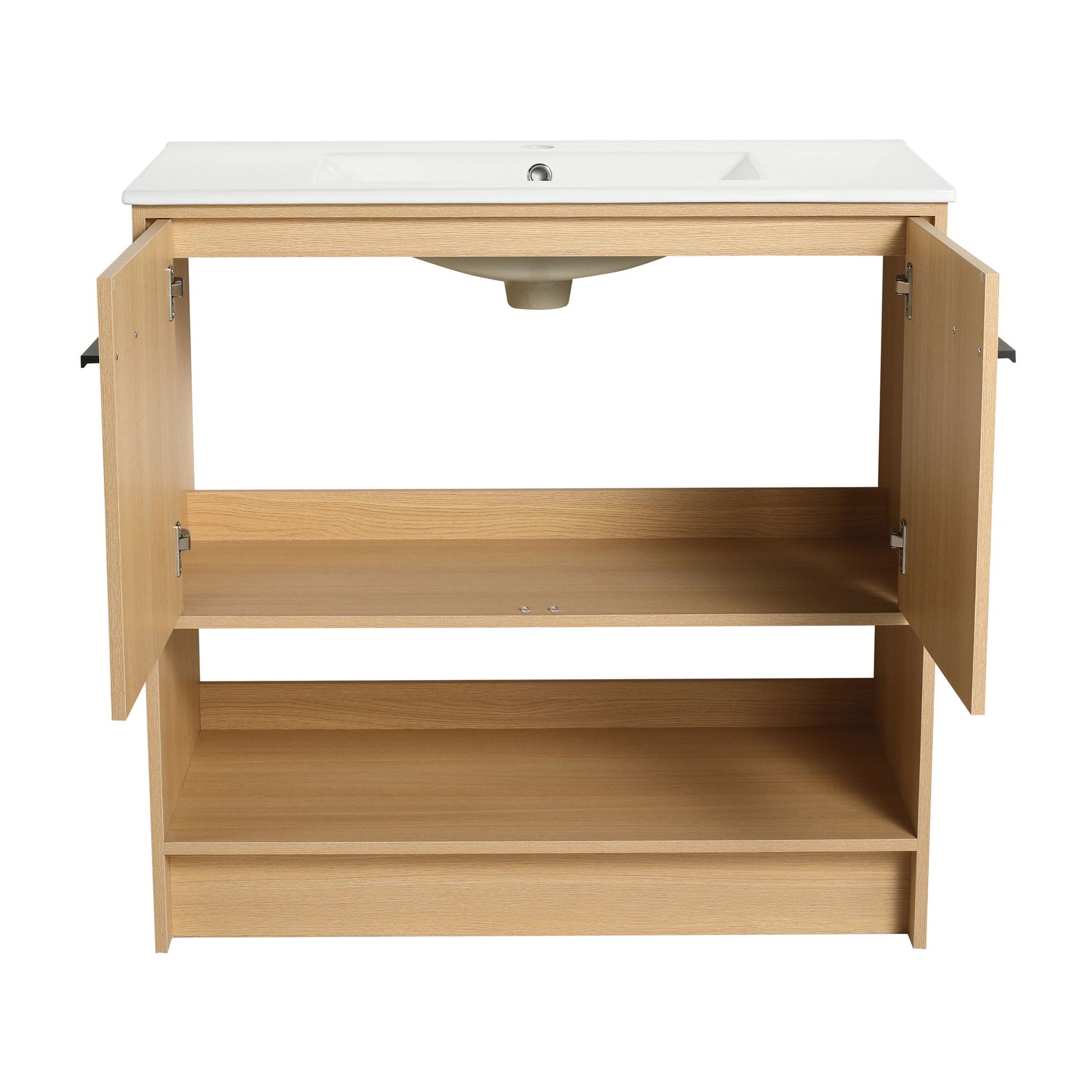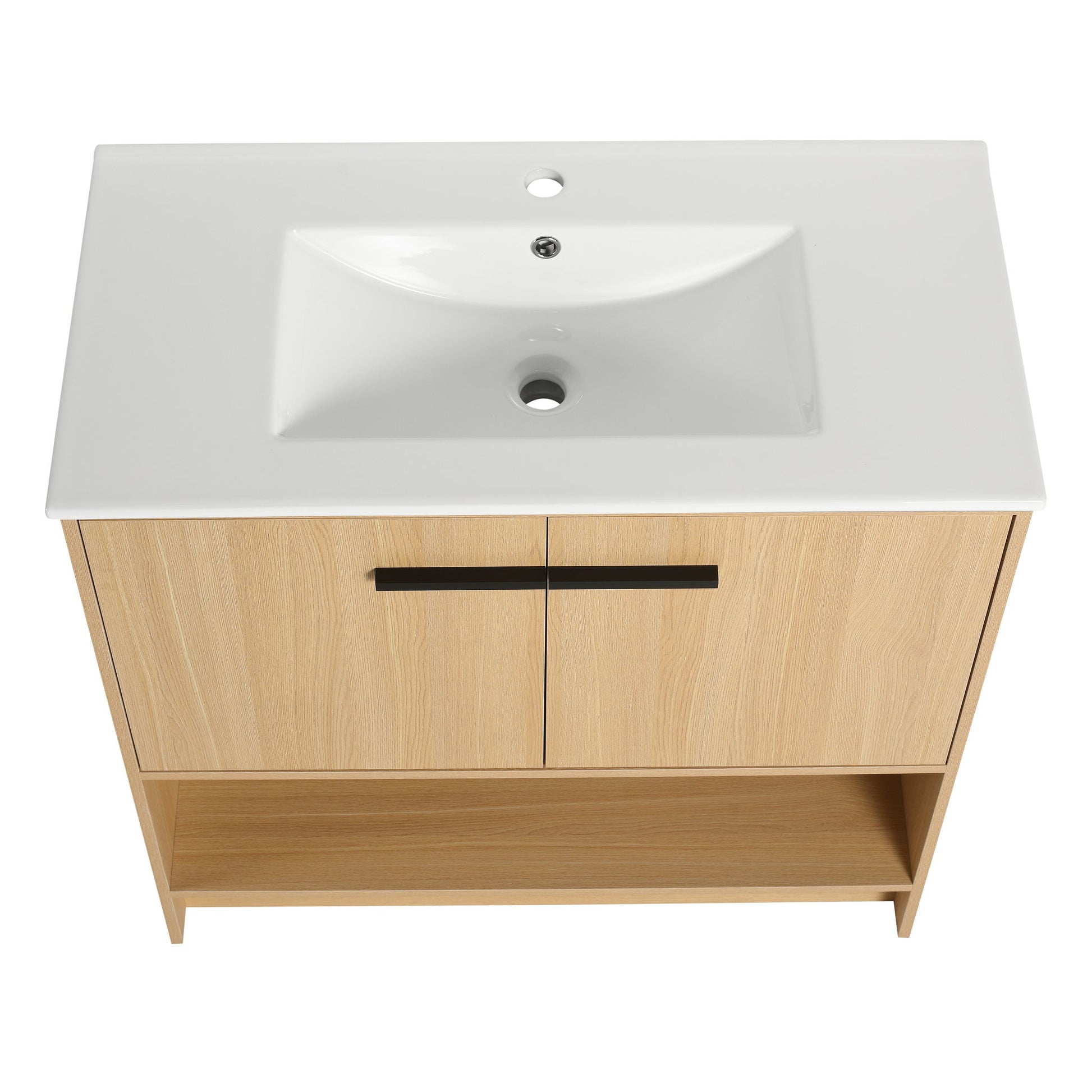 Modern Bathroom Vanity With Ceramic Sink And Soft Closing Doors, 36" Freestanding Cabinet - Oak