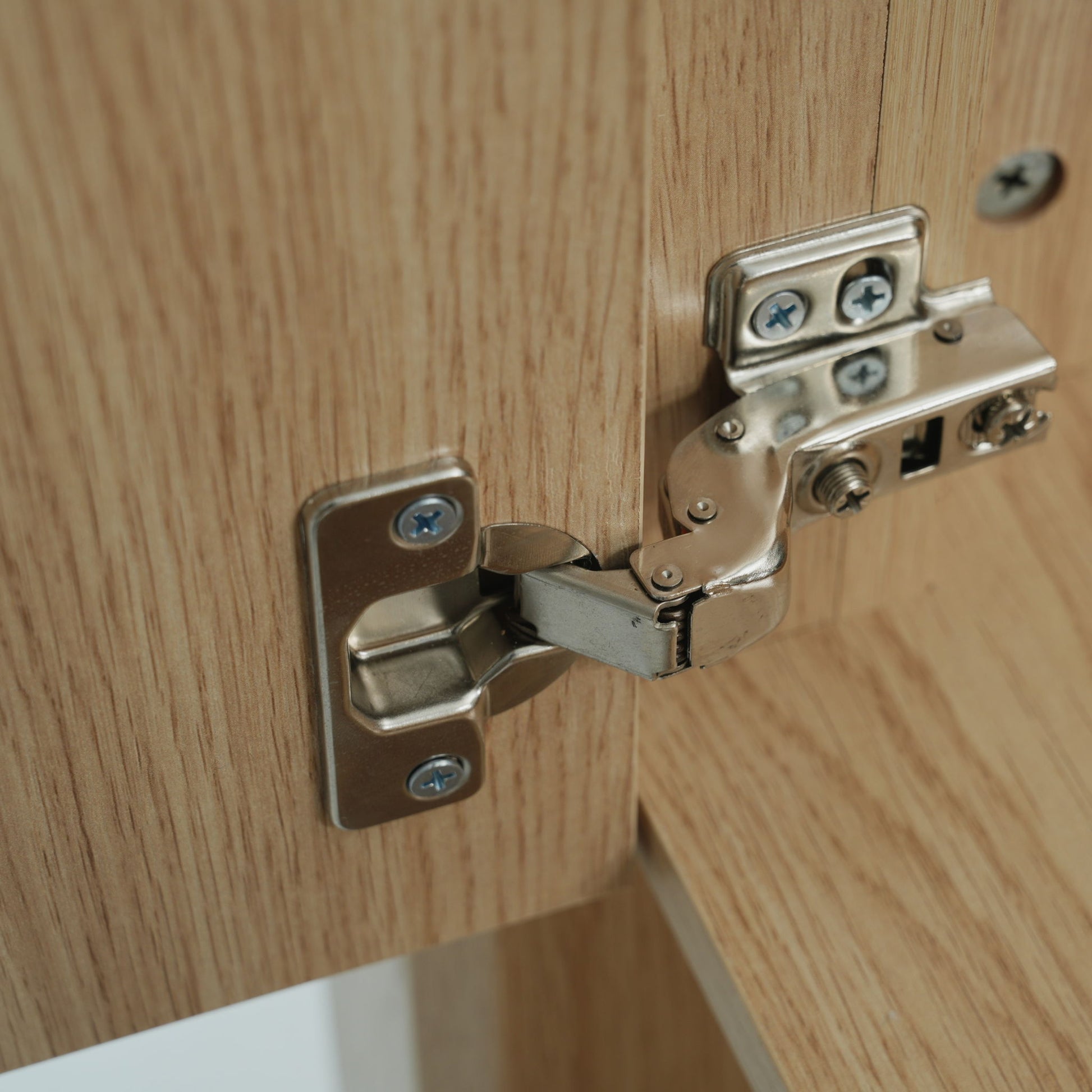 - Modern Bathroom Cabinet with Soft-Closing Hinges and Free-Handle Design: The cabinet doors are designed with a contemporary 45-degree angle and a free-handle design for a sleek, minimalist look.