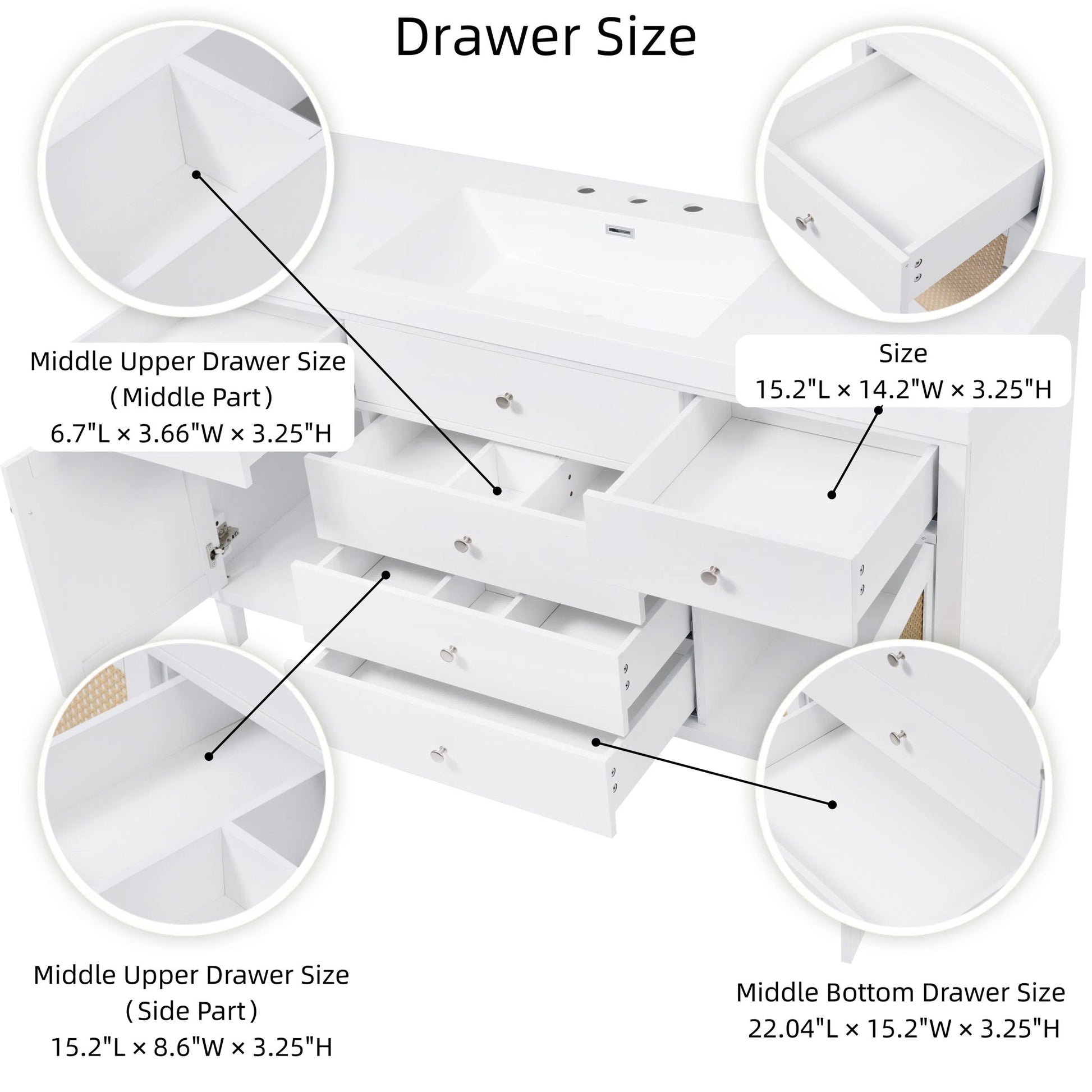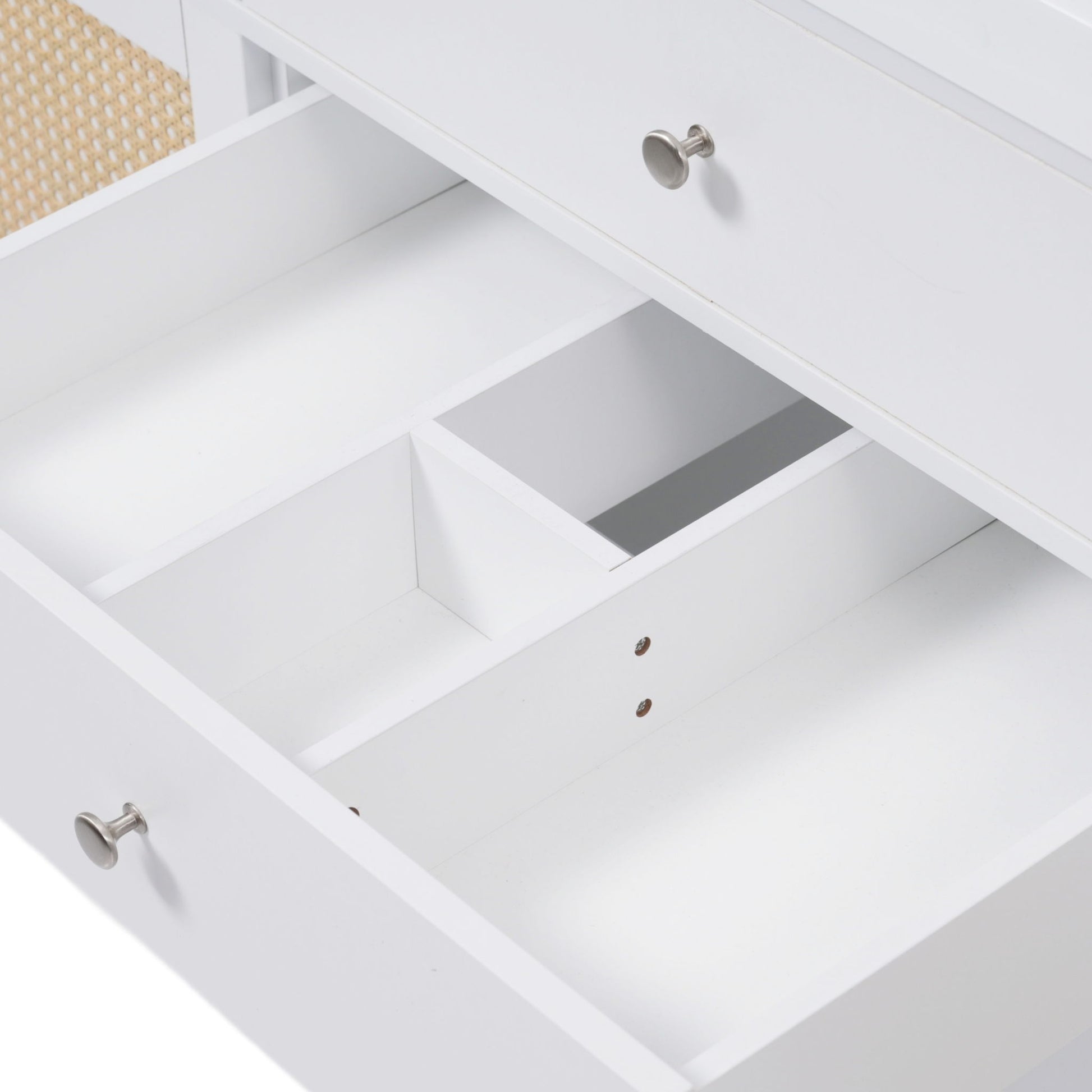 - Smart Storage Organization: Five soft-close drawers and two rattan-front cabinets offer flexible, categorized storage for small and large items.