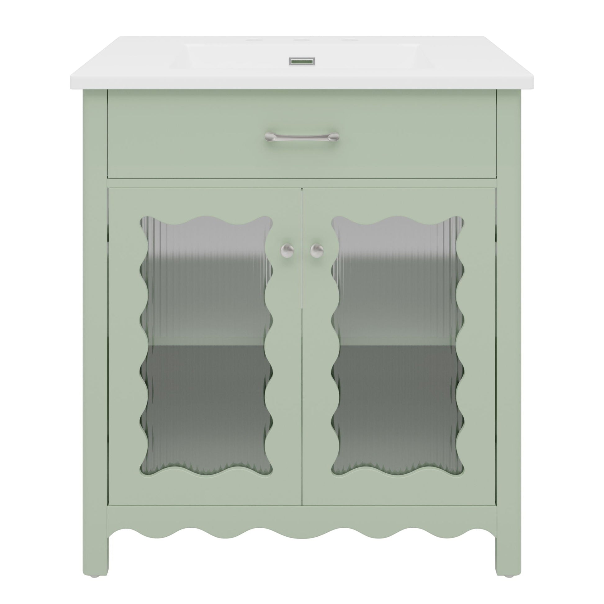 This modern bathroom vanity features a durable ceramic sink and tempered glass doors, ideal for enhancing your bathroom's function and style with a sleek, contemporary look.