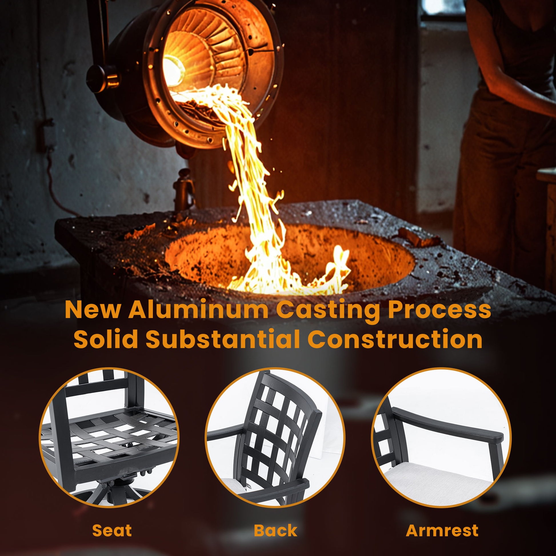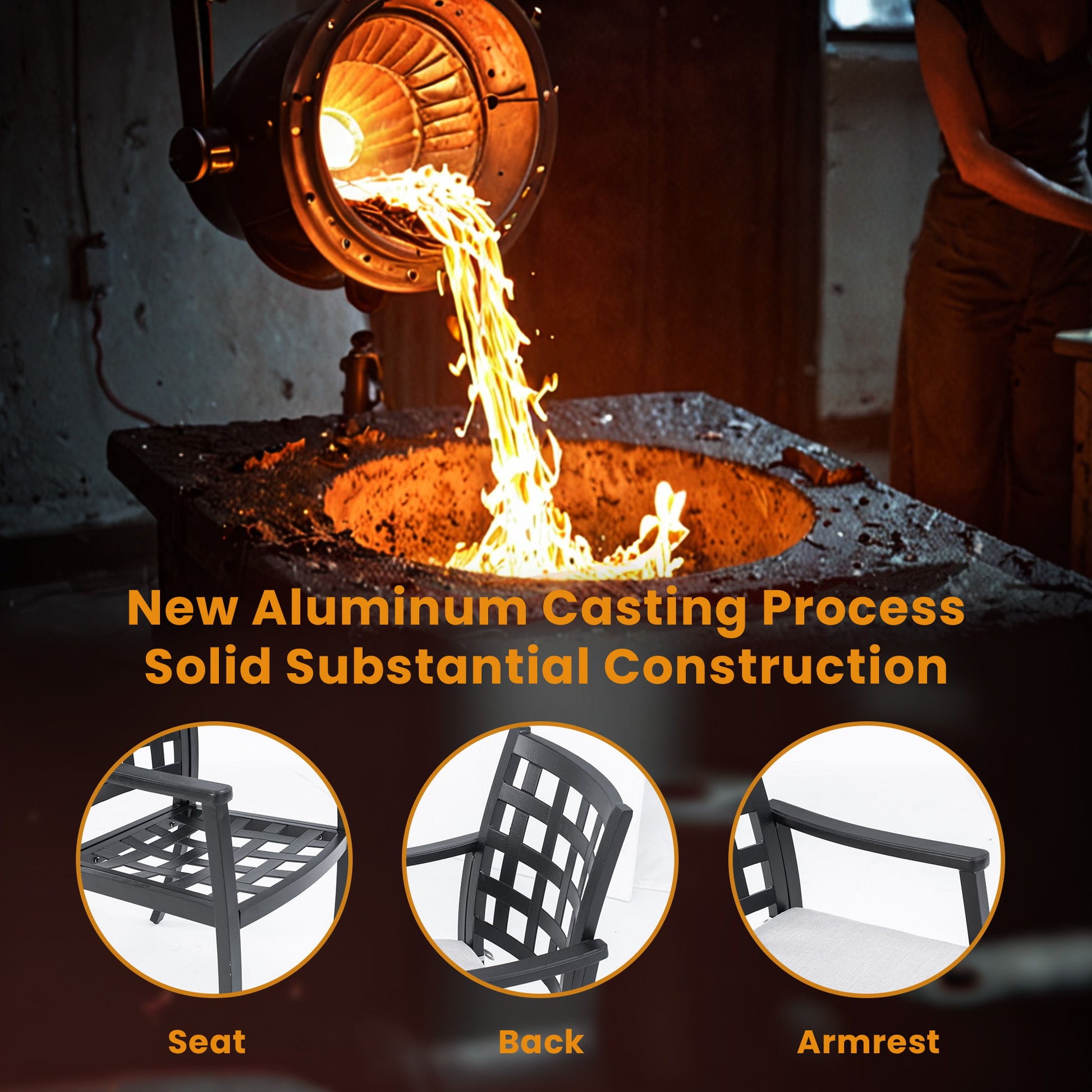 - Elegant Lattice Design: Features a minimalist cast aluminum lattice pattern with refined curves on the backrest, seat, and armrests - merging classic elegance with modern simplicity to suit any outdoor setting.