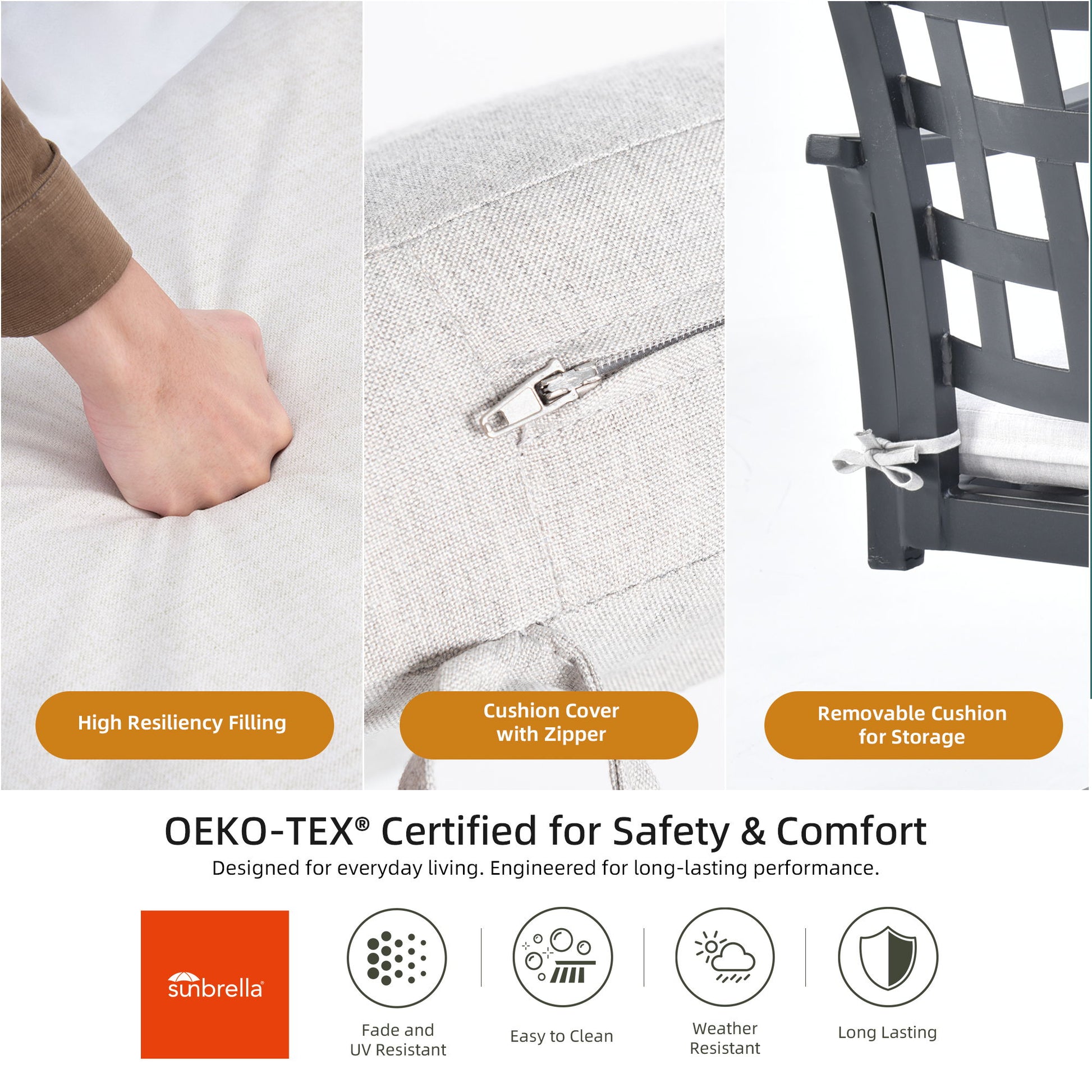 - All-Weather Cushions: Includes Cast Silver Sunbrella cushions, known for fade, stain, and weather resistance. Cushions are removable, zippered, and filled with high-density foam for easy care and long-lasting comfort.