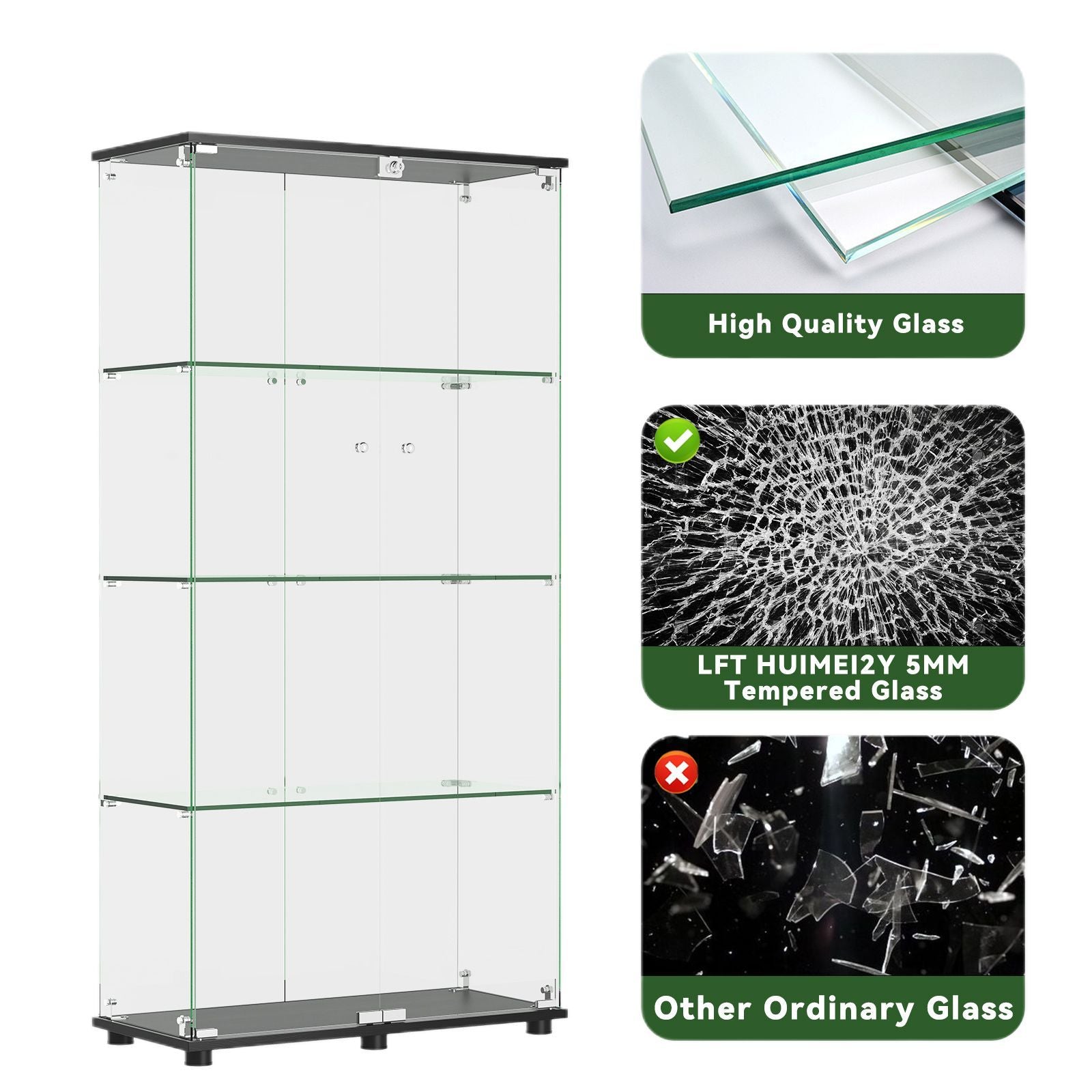 Modern Glass Display Cabinet With 4 Shelf Double Doors And Lock, Tempered Glass Bookshelf For Living Room - Black