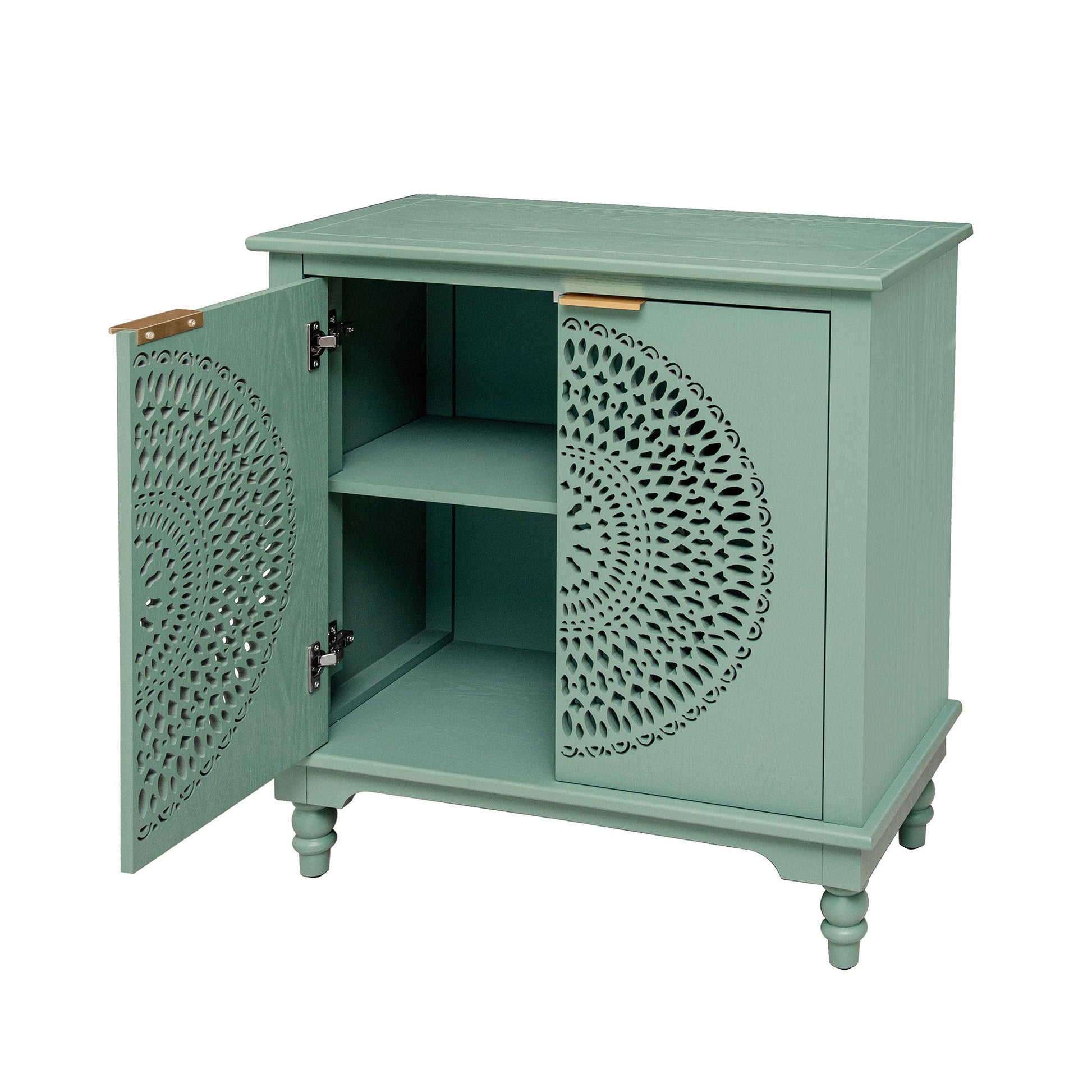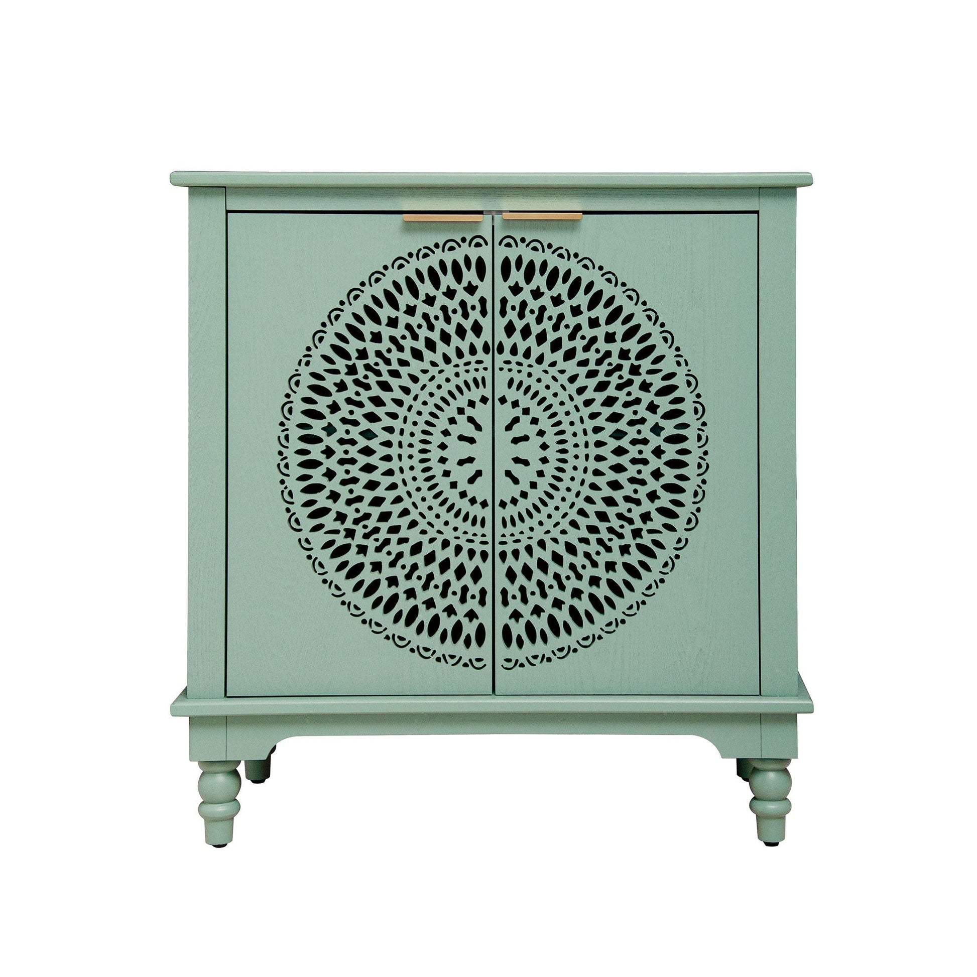 This modern accent cabinet features a hollow-carved design and serves as a versatile storage solution for entryways, living rooms, or bedrooms. Its stylish light green finish adds both function and aesthetic appeal to your space.
