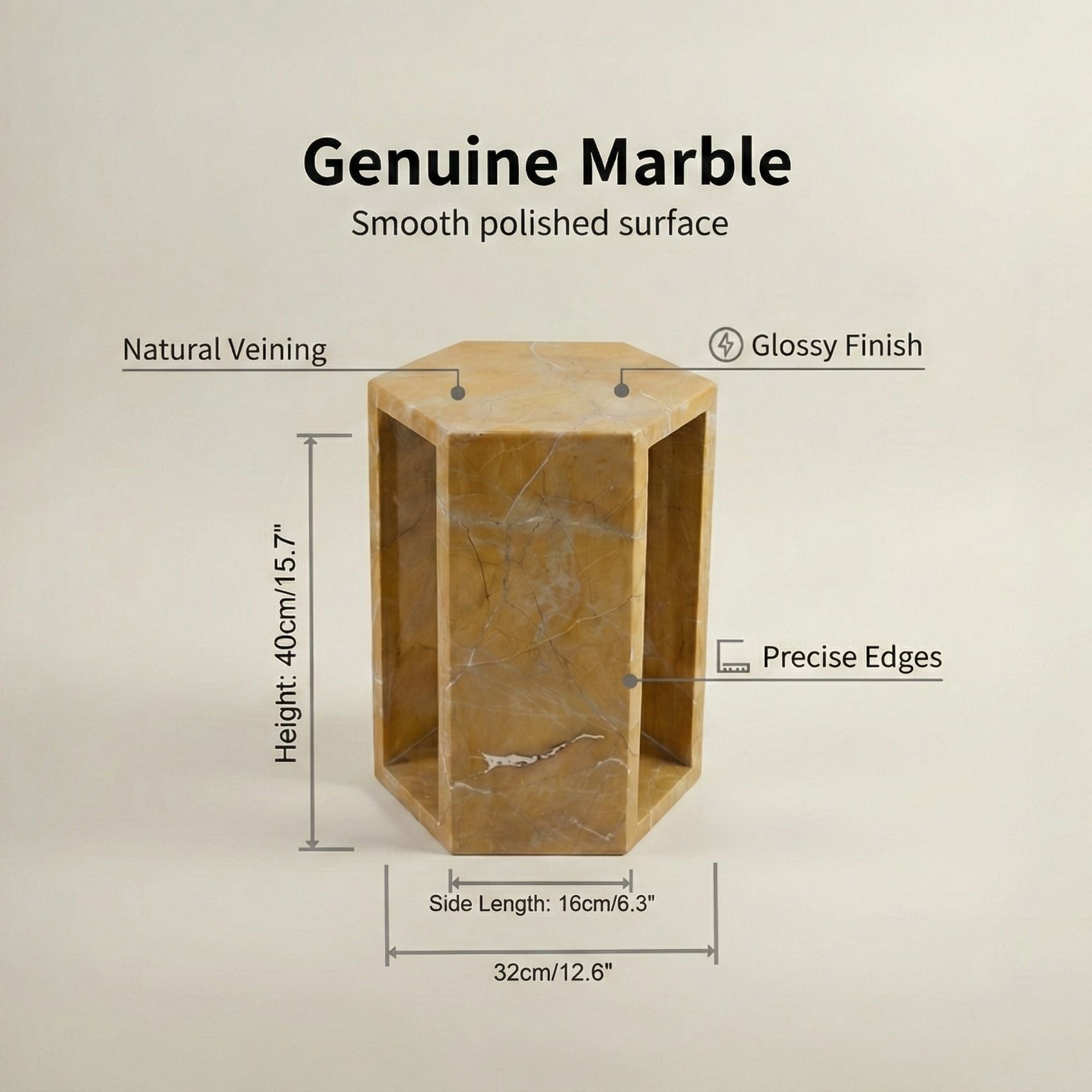 Hexagon Side Table Geometric Stone With Veining Polished Pedestal Nightstand For Living Room - White / Multi