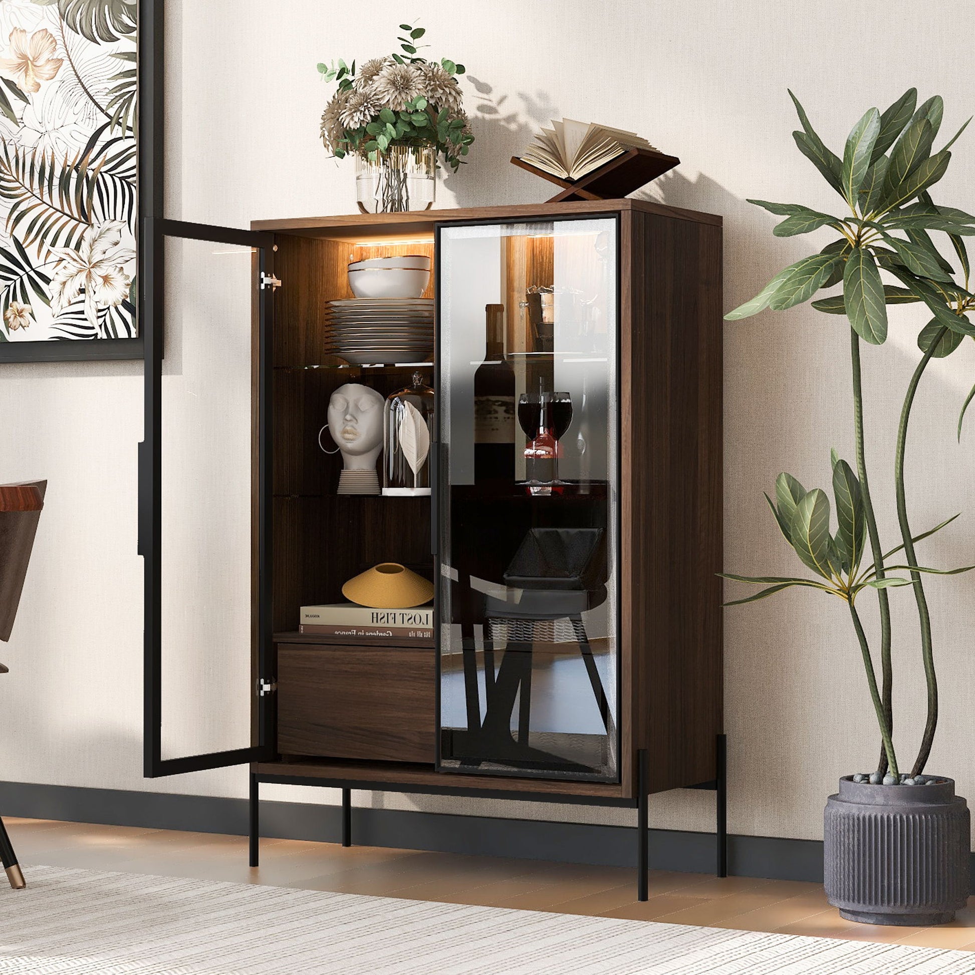Modern Minimalist Style LED Curio Cabinet With Tempered Glass Door, Metal Legs - Black / Dark Walnut