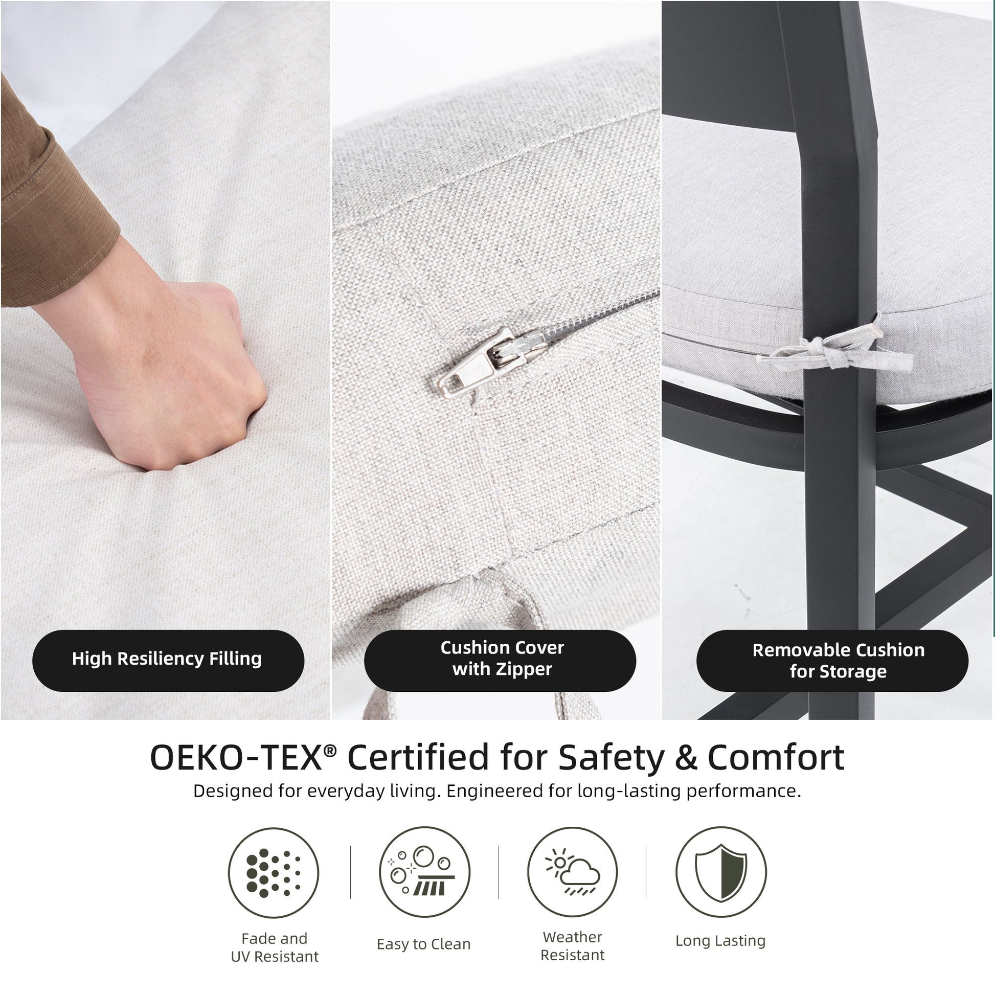- Comfortable Seat Cushion: High-density foam retains shape over time; removable zippered cover allows for easy cleaning