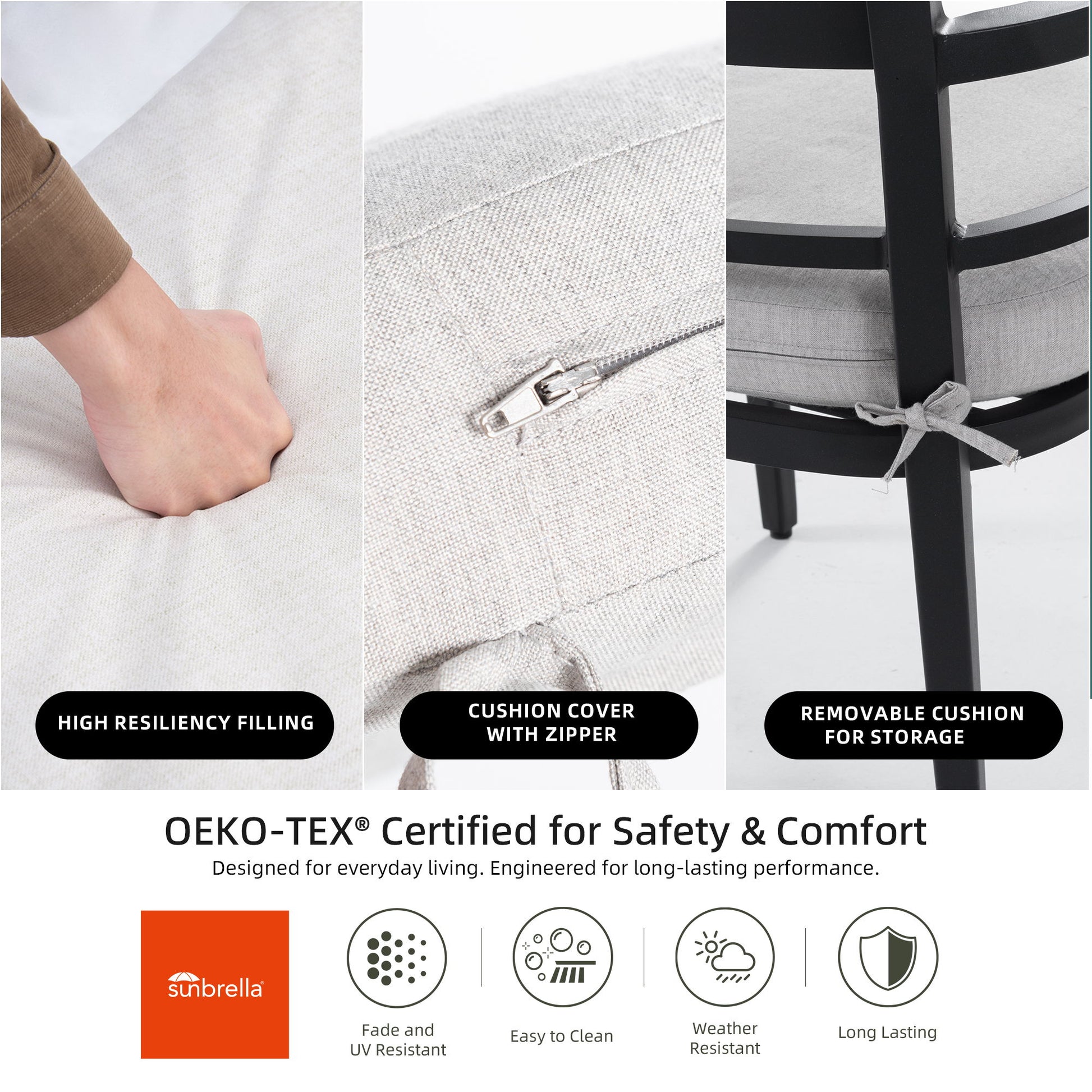 - Cushions: Made of Sunbrella fabric for durability, fade resistance, and stain resistance, with removable covers.