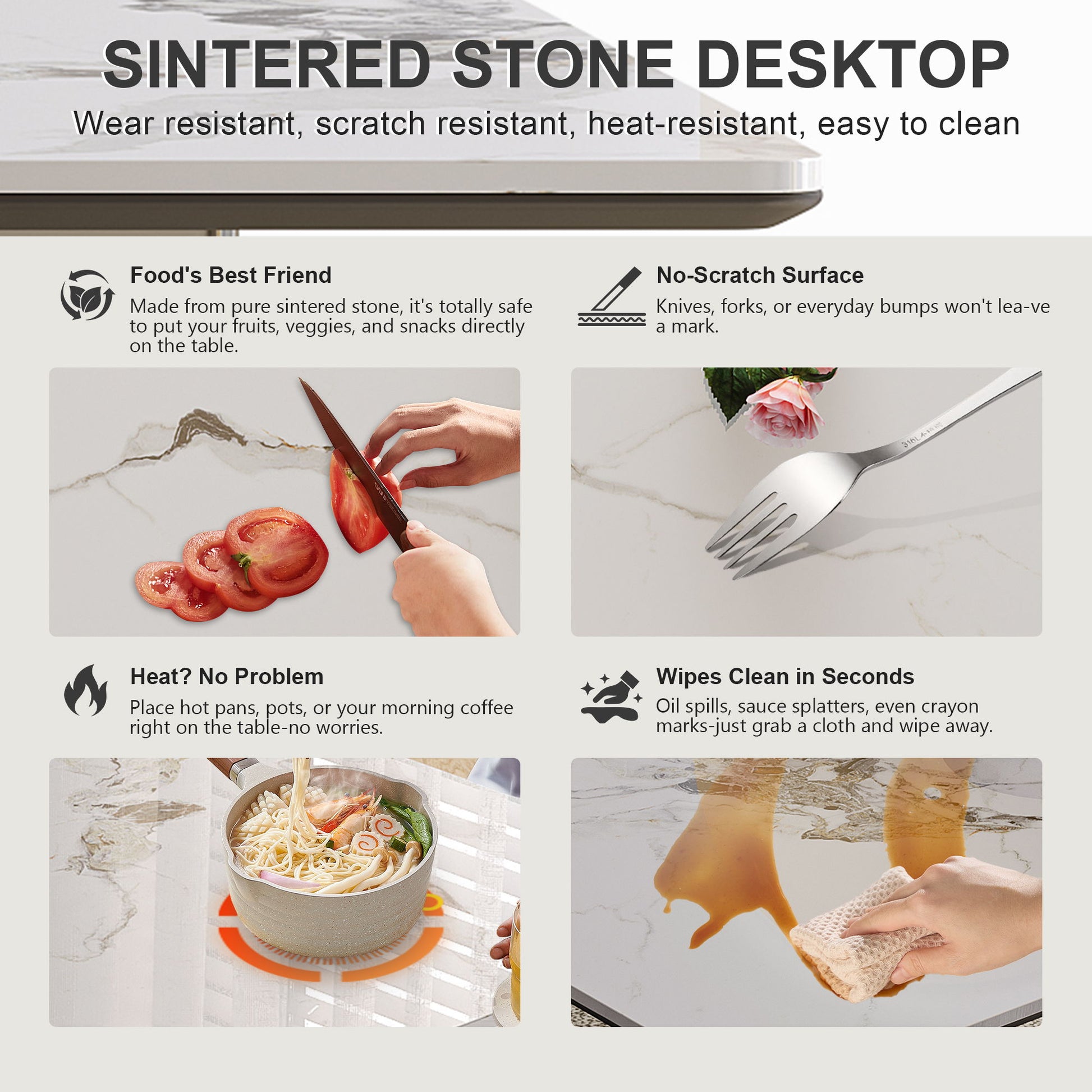 - Premium Sintered Stone Top: 12mm thick, scratch-resistant, fireproof, and oil-repellent with a warm, smooth finish.