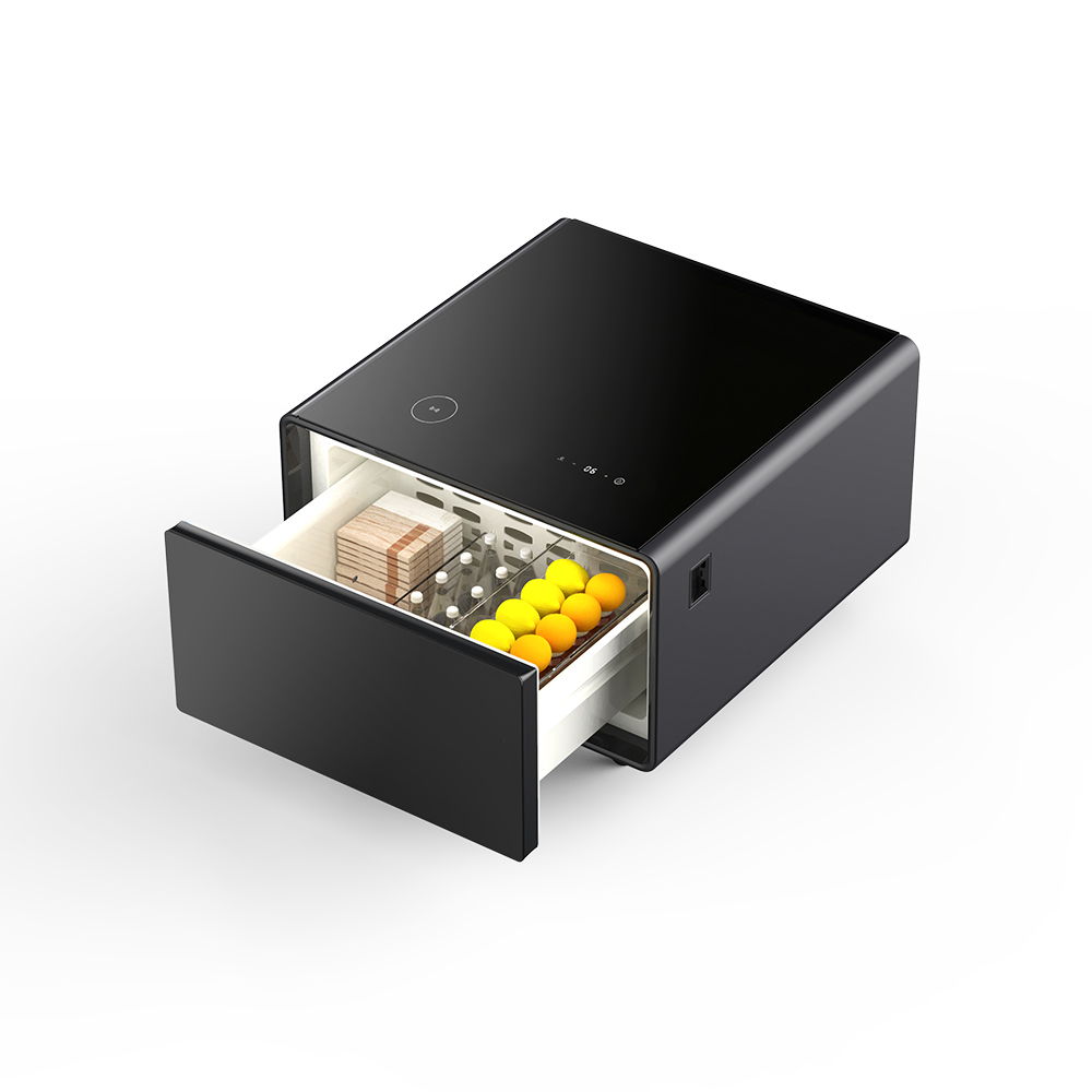 - Smart Cooling Drawer: The side table features a refrigerated drawer with adjustable temperature settings (37-46°F) to store beverages and snacks in separate partitions.