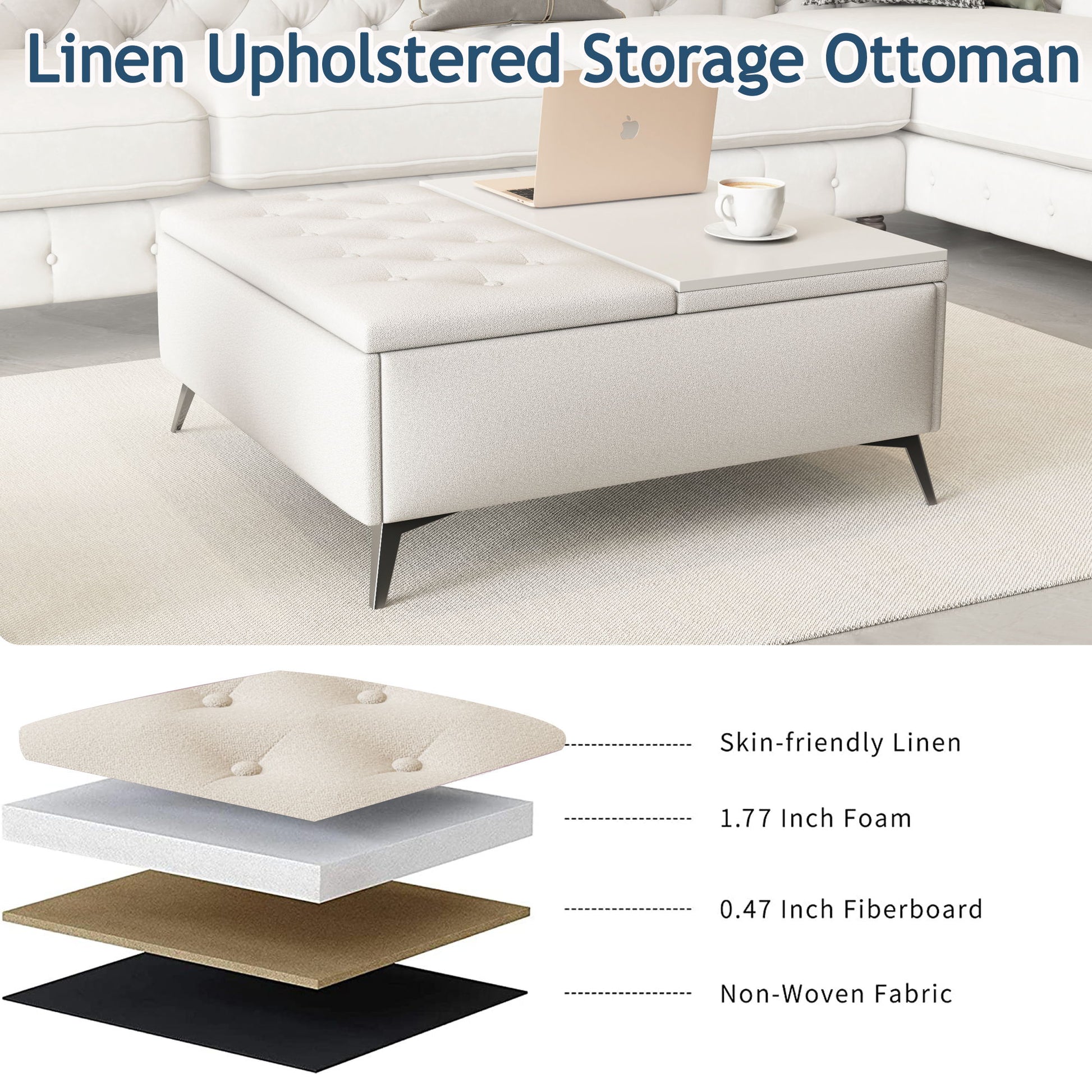 Modern Wood And Fabric Square Storage Ottoman Coffee Table With Lift - Top Design - Upholstered Bench For Living Room Organization - Beige
