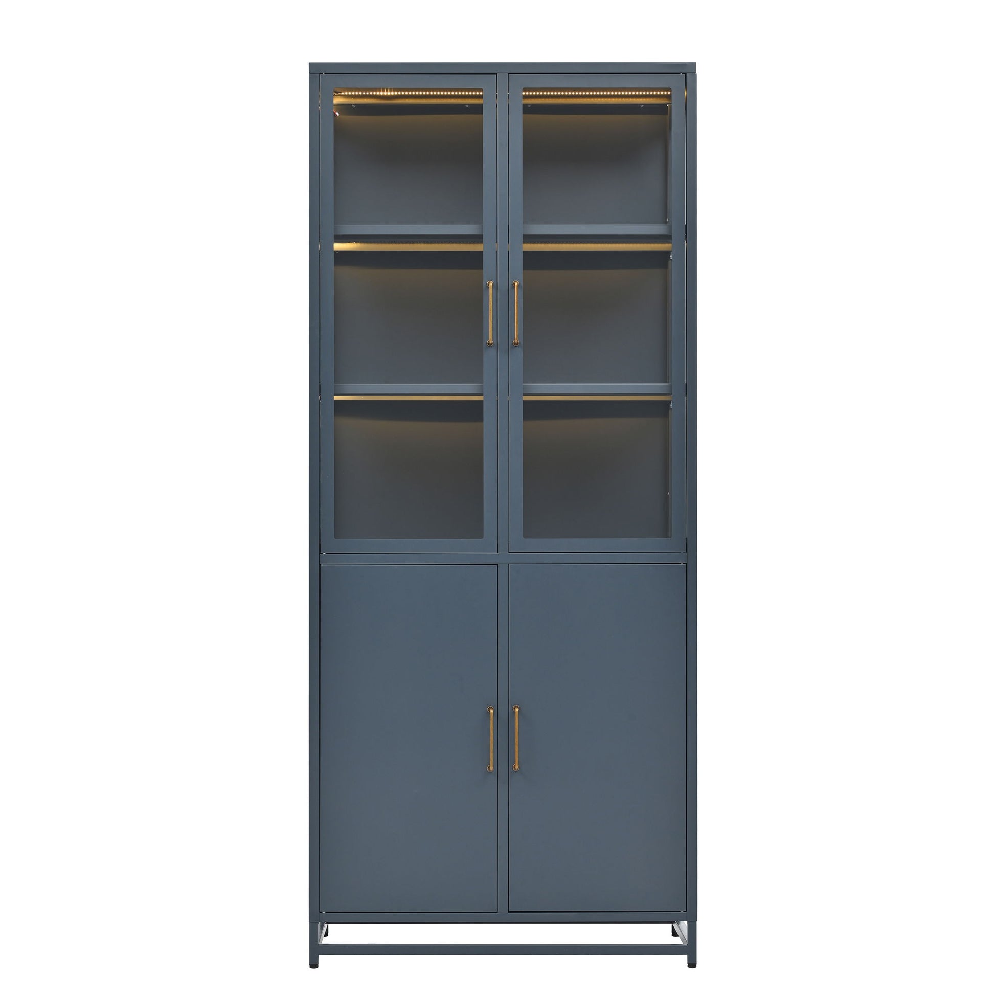 Modern Style Tall Steel Display Cabinet With Double Glass Doors, LED Lights, 3 Sided Glass For Collectibles Dark - Dark Blue