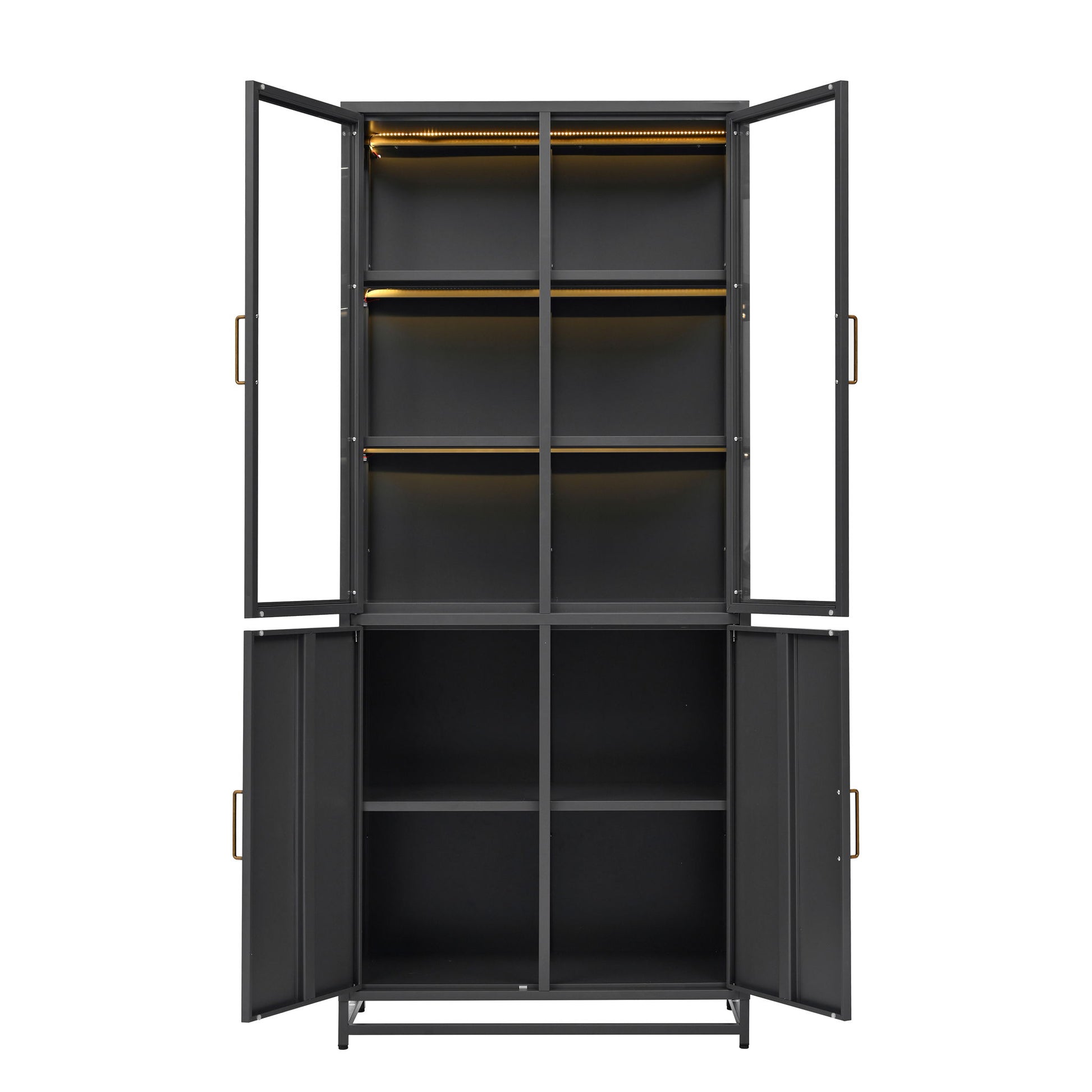 Modern Style Tall Steel Display Cabinet With Double Glass Doors, LED Lights