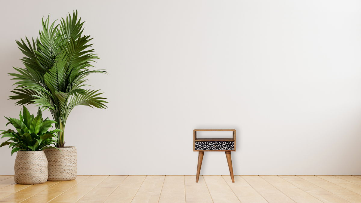- Artisan Furniture Solid Wood Mosaic Nightstand 1 drawer - This nightstand has been constructed from 100% solid mango wood with a fine oak-ish finish. It features a black and white 3D Resin Inlay pattern drawer front which is bound to uplift your bedroom and allow you to store any bits and pieces discreetly along with an open slot for extra storage. It also has 4 Nordic style legs and ample space on top for a lamp, photo frames or ornaments.
