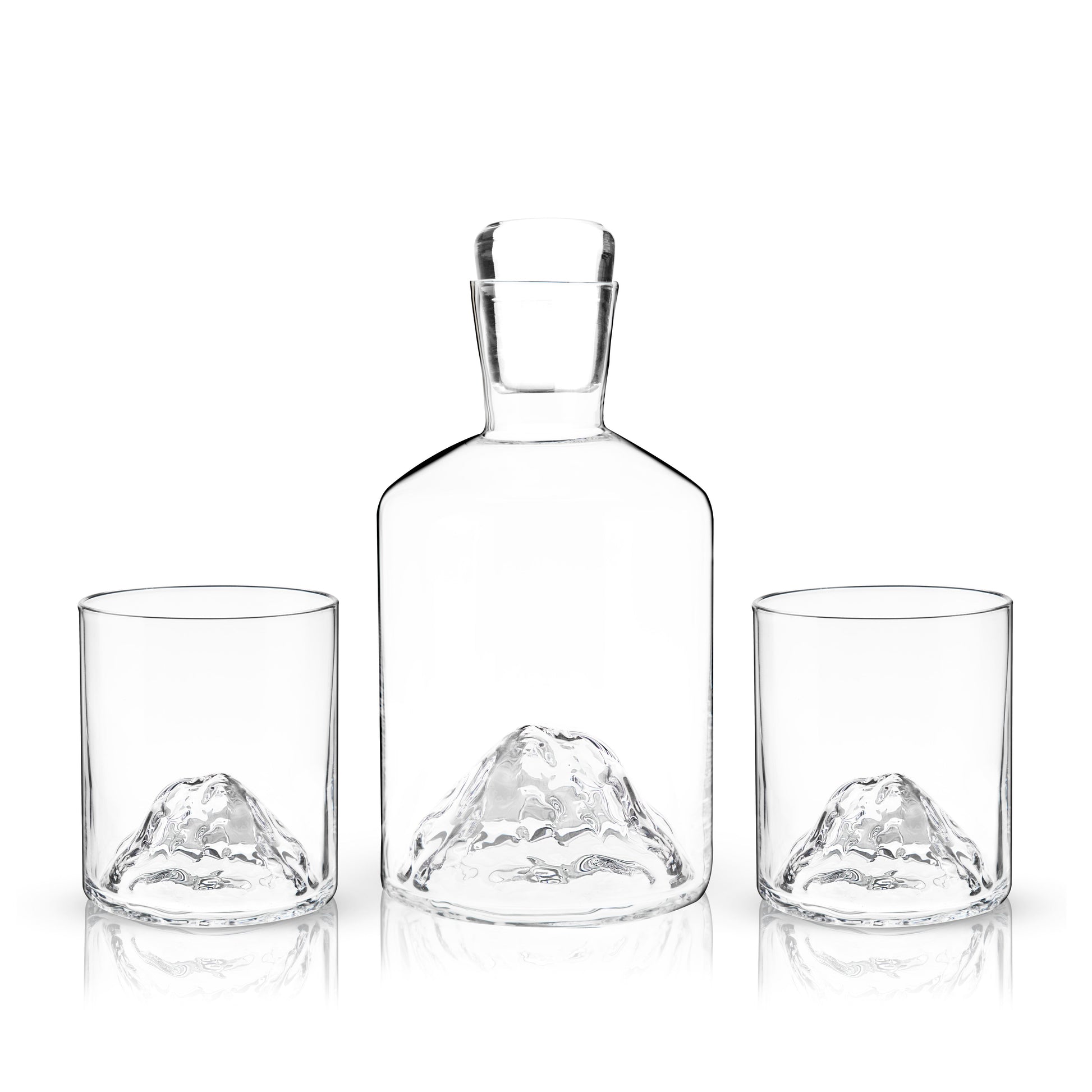 Display your liquor in style with this unique mountain decanter and tumbler set. This crystal liquor decanter set pays homage to the lofty peaks of the Pacific Northwest with a hand-blown, dimensional mountain base. These handmade items may exhibit slight variations.