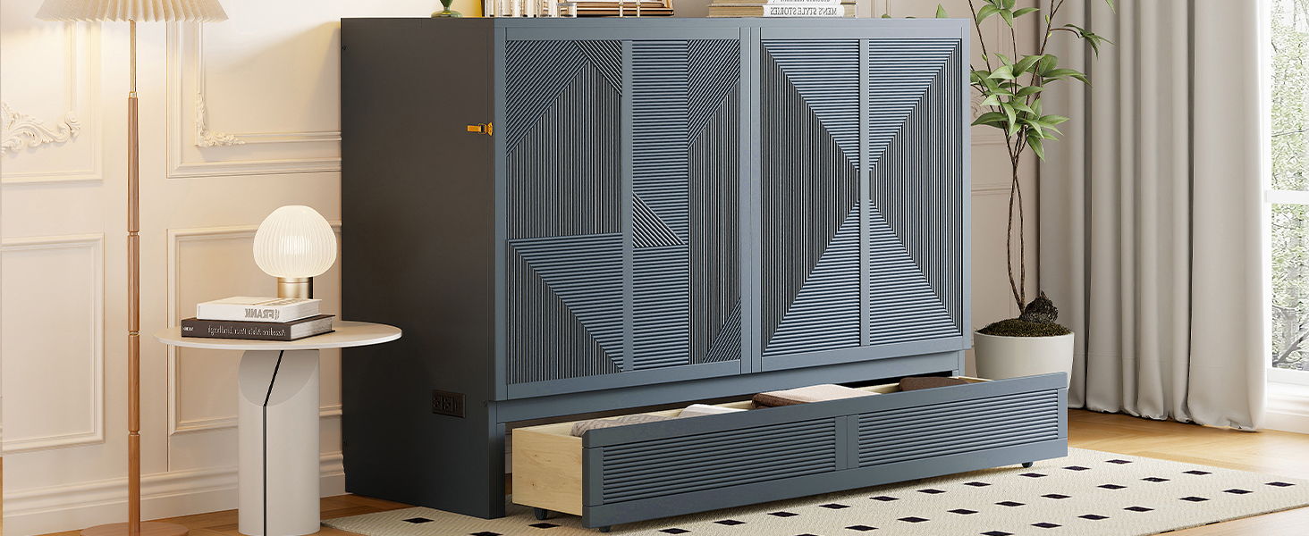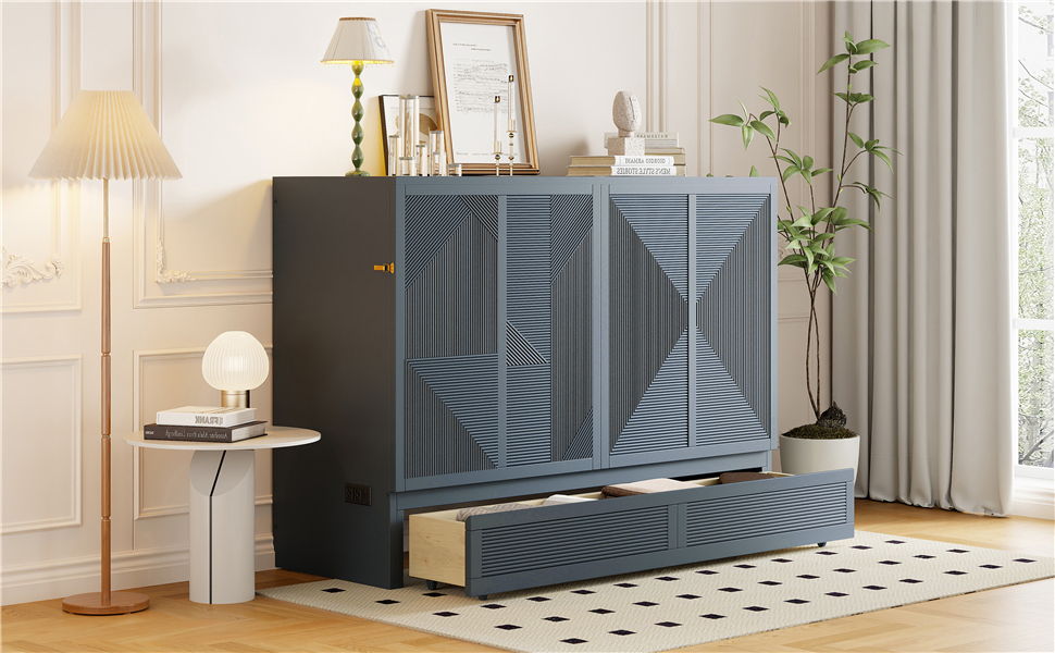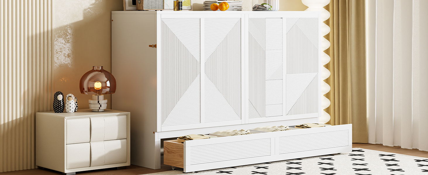 Functional Storage: Featuring a built-in drawer in cabinet mode, this Murphy bed provides extra storage space for essentials. The cabinet is designed to neatly store a tri-fold mattress (up to 6 inches thick).