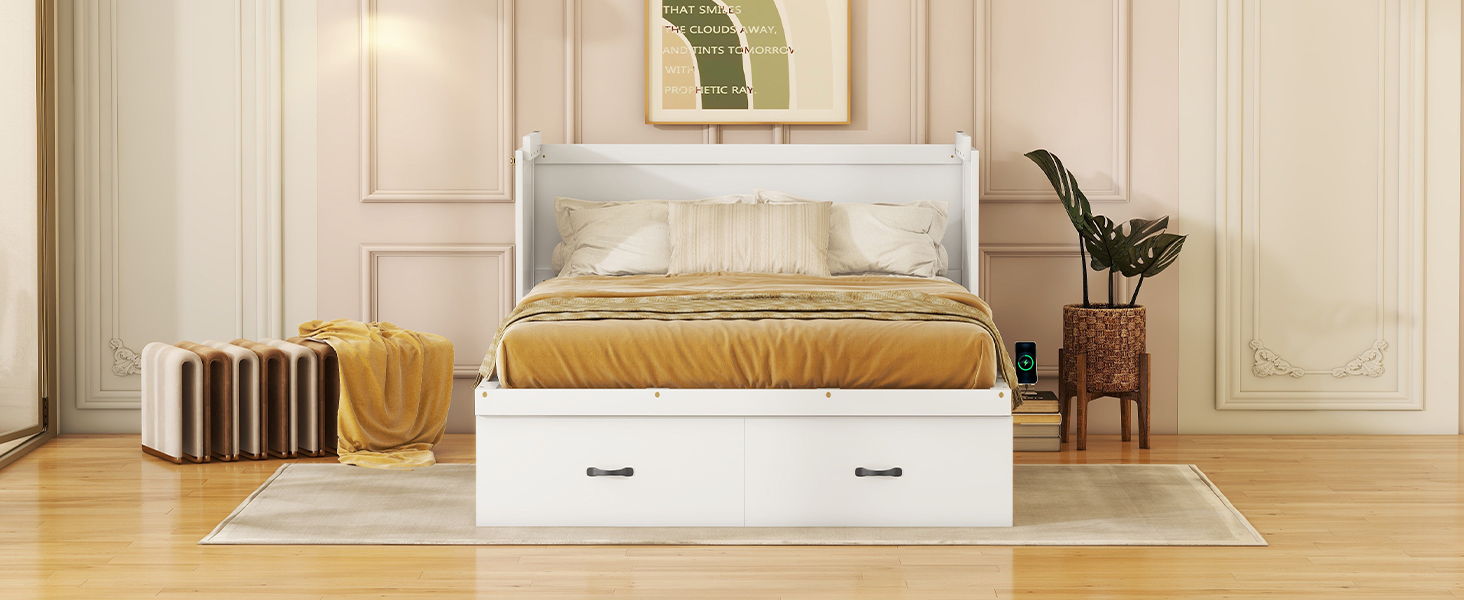 Full Size Murphy Bed With USB Port And A Large Drawer - White
