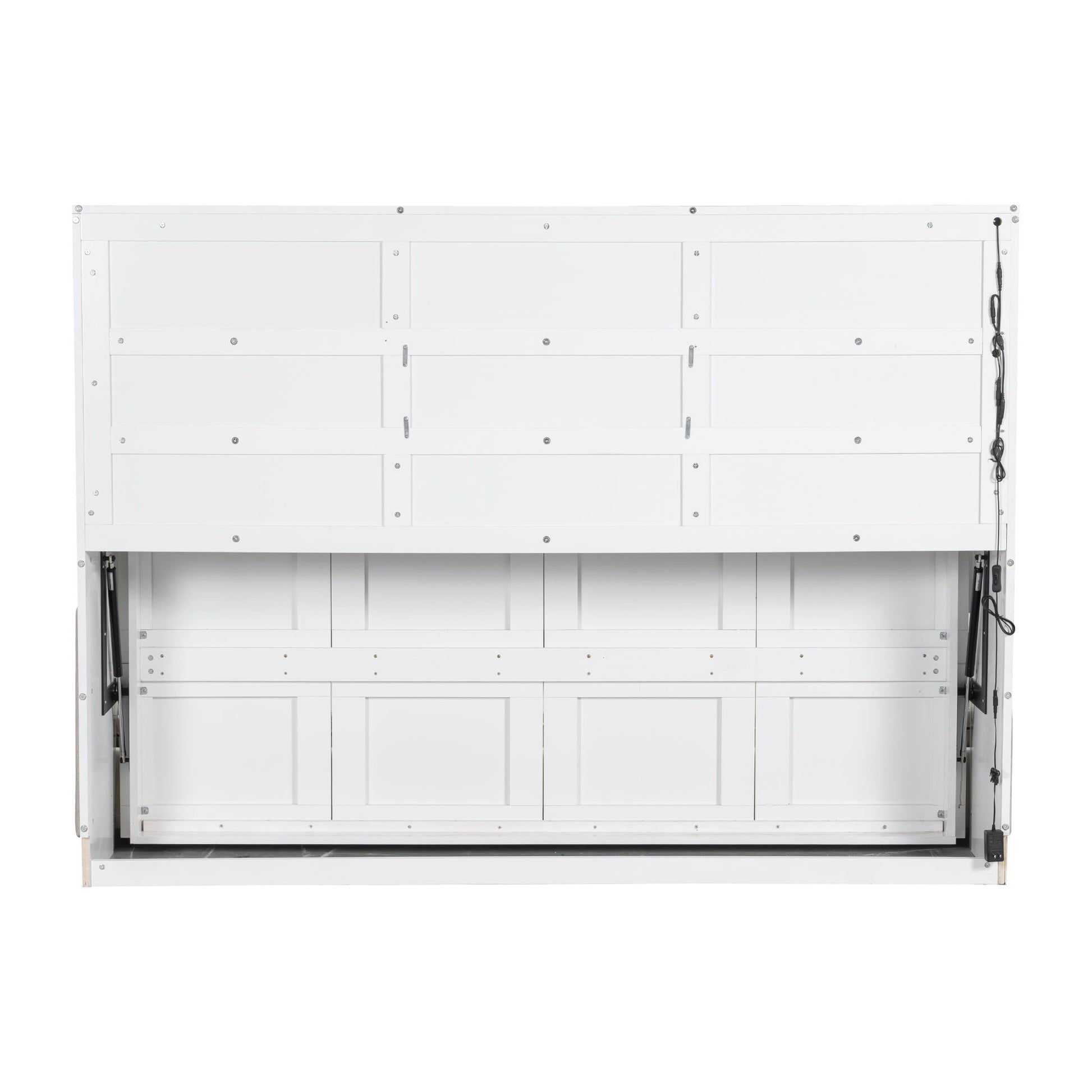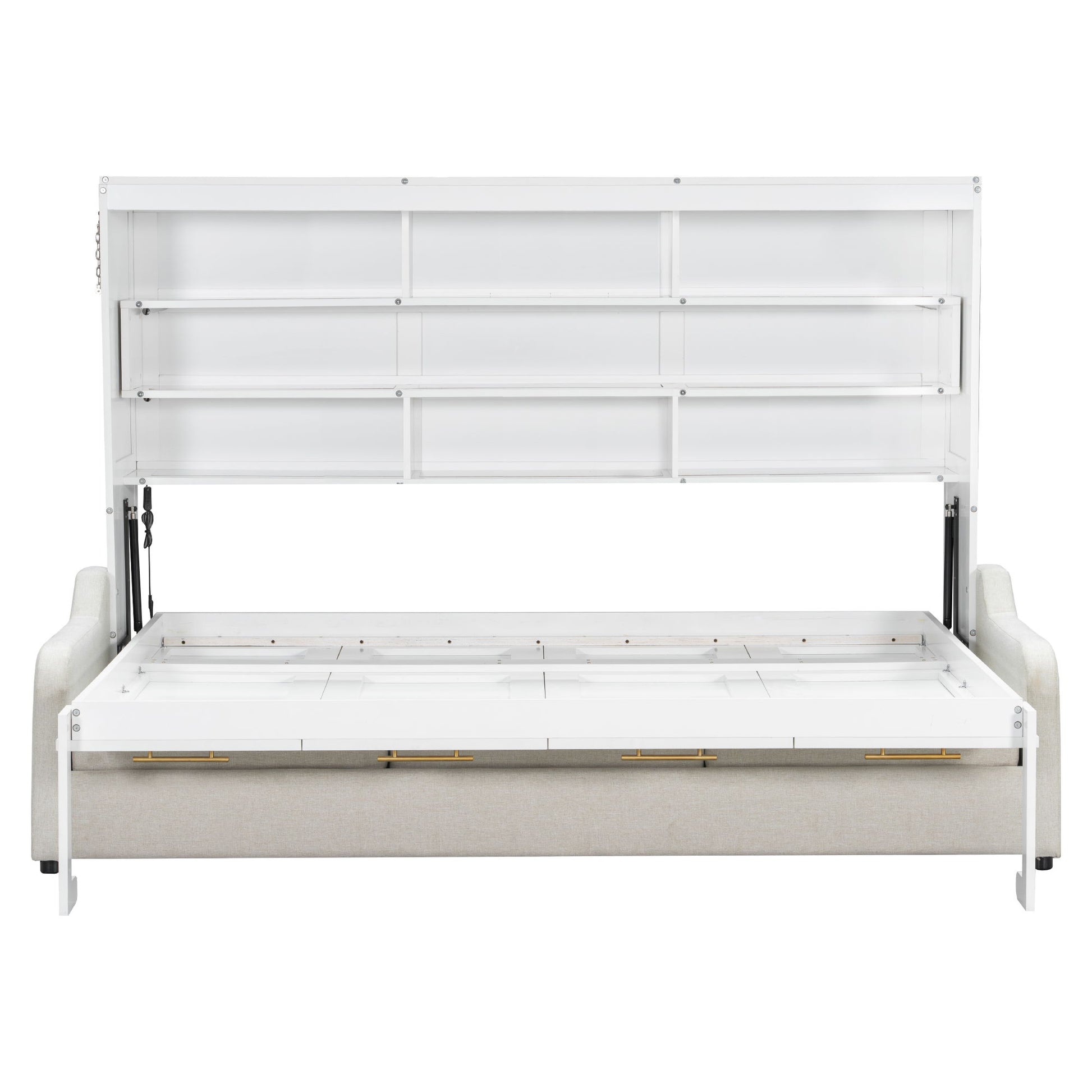 Queen Size Murphy Cabinet Bed With Folding Sofa, Built In Storage Shelves And LED Light - Beige