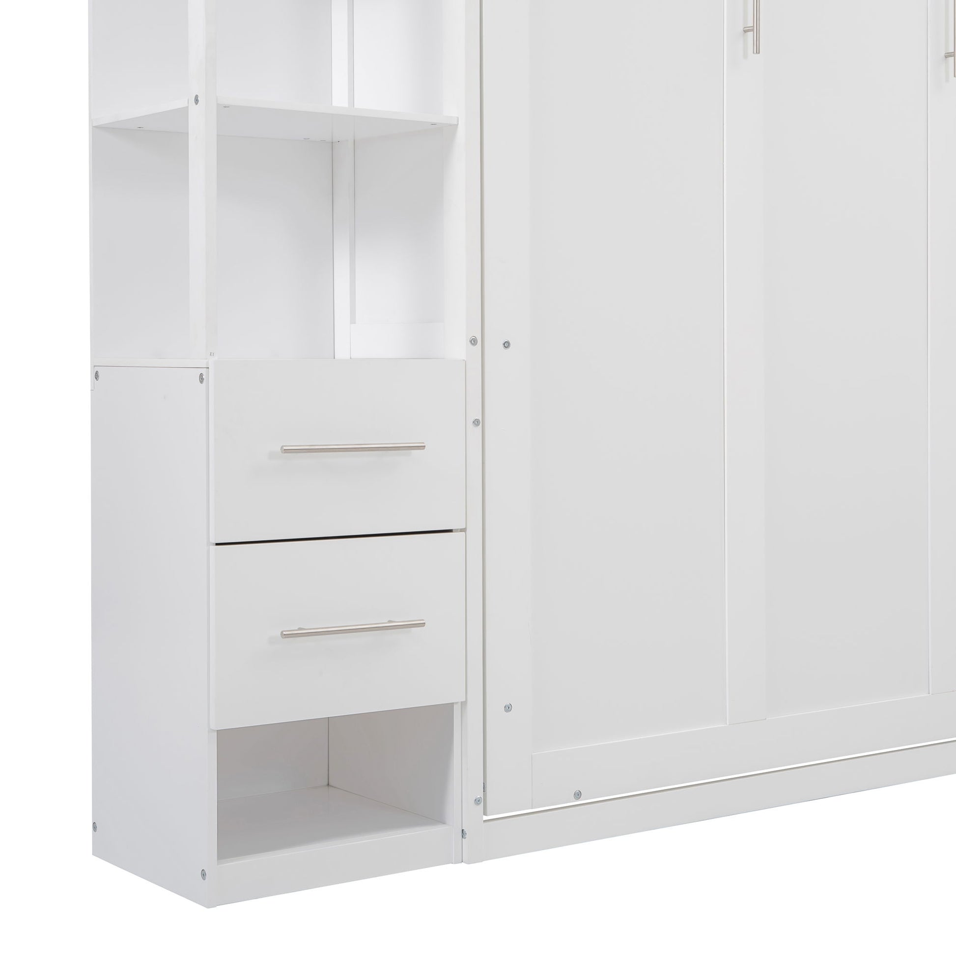 Multi-function: This versatile Murphy bed folds seamlessly into a cabinet, instantly freeing up floor space. Ideal for guest rooms, home offices, or gyms, it features 2 four-layer shelves and 4 spacious drawers for organized storage – combining smart functionality with stylish design.