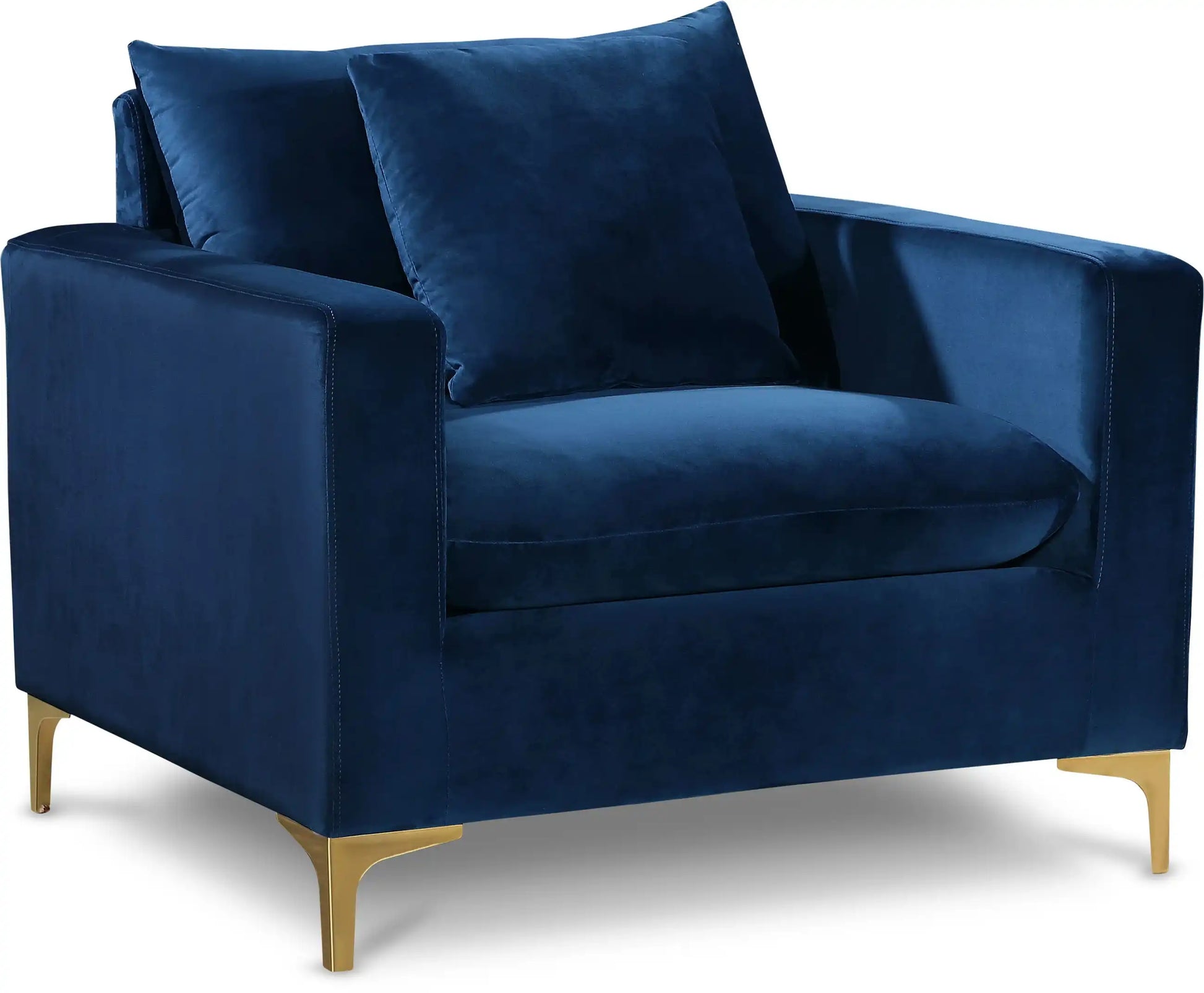 Curl up with a good book from the welcoming confines of this Naomi Chair. The color of this chair adds a bold touch to your decor and shakes up otherwise neutral color schemes. Plush velvet material feels cozy and comfortable against your skin, while deep seat cushions provide lots of room for you to stretch your legs. This chair comes with both and legs, so you can customize its look to meet your decor plans. Pillows are included for added homey warmth and comfort.