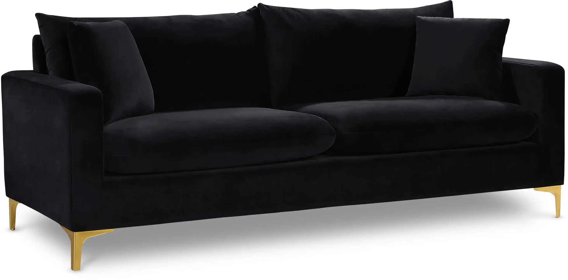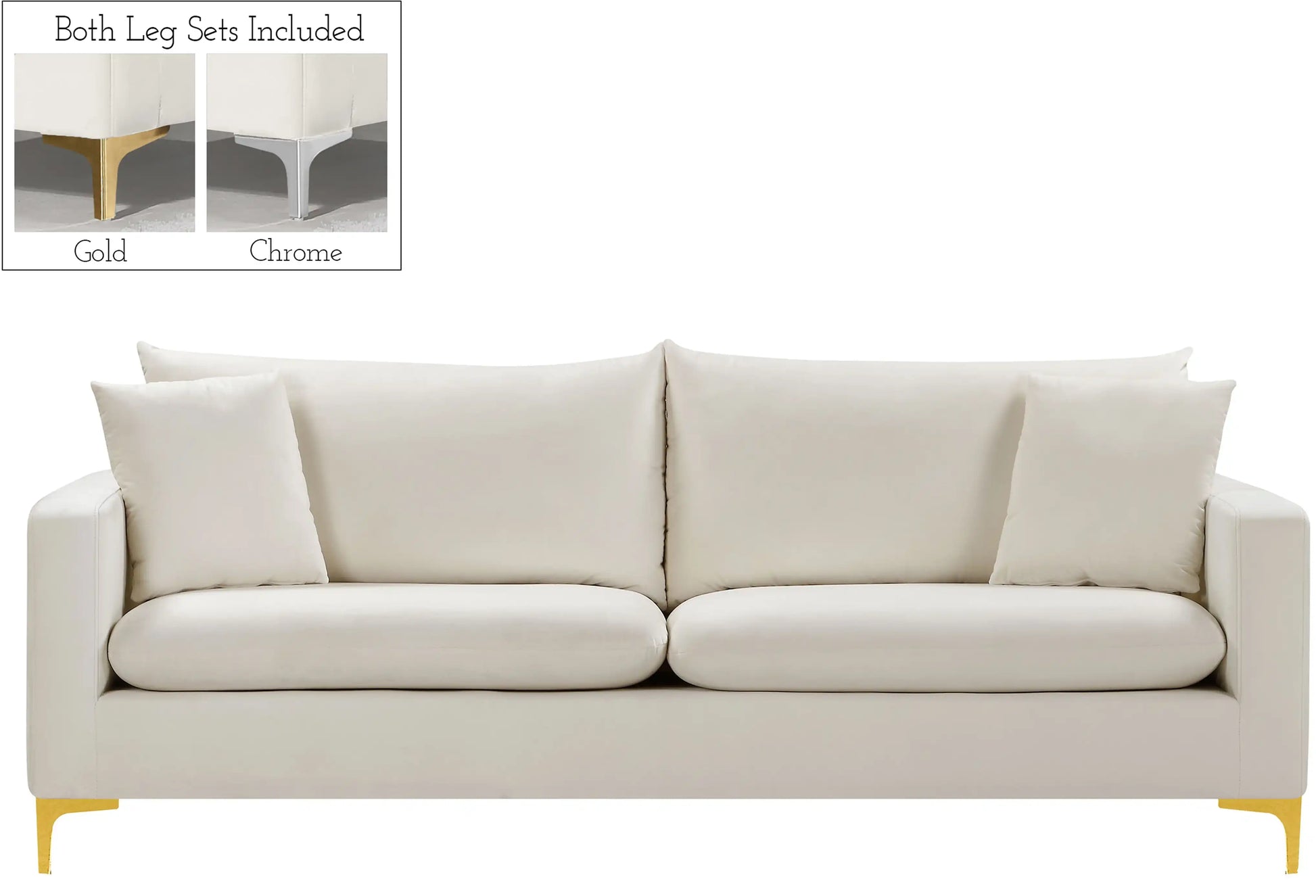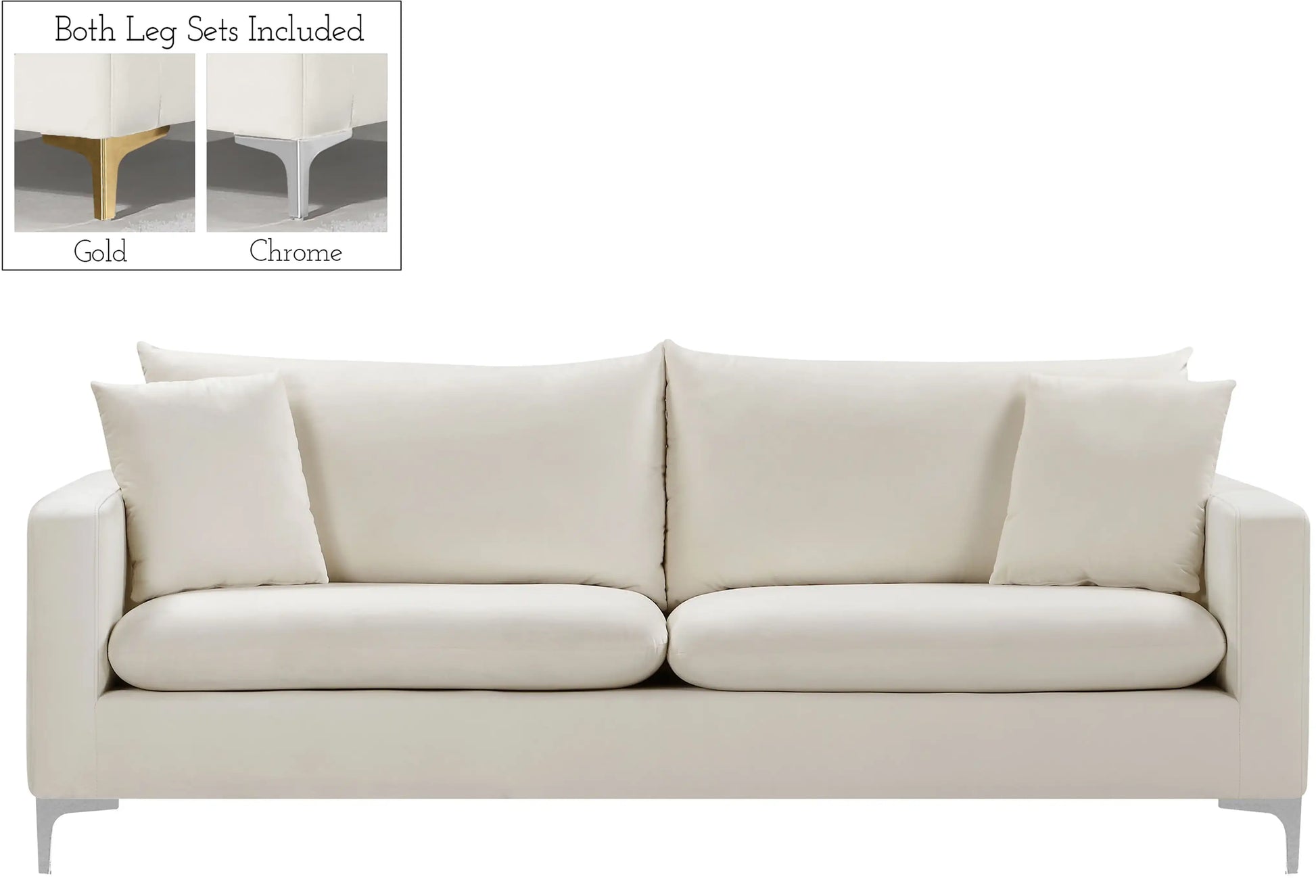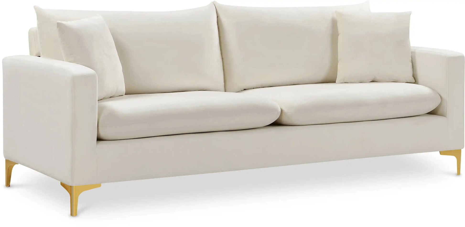 Curl up with a good book from the welcoming confines of this Naomi Sofa. The color of this sofa adds a bold touch to your decor and shakes up otherwise neutral color schemes. Plush velvet material feels cozy and comfortable against your skin, while deep seat cushions provide lots of room for you to stretch your legs. This sofa comes with both and legs, so you can customize its look to meet your decor plans. Pillows are included for added homey warmth and comfort.