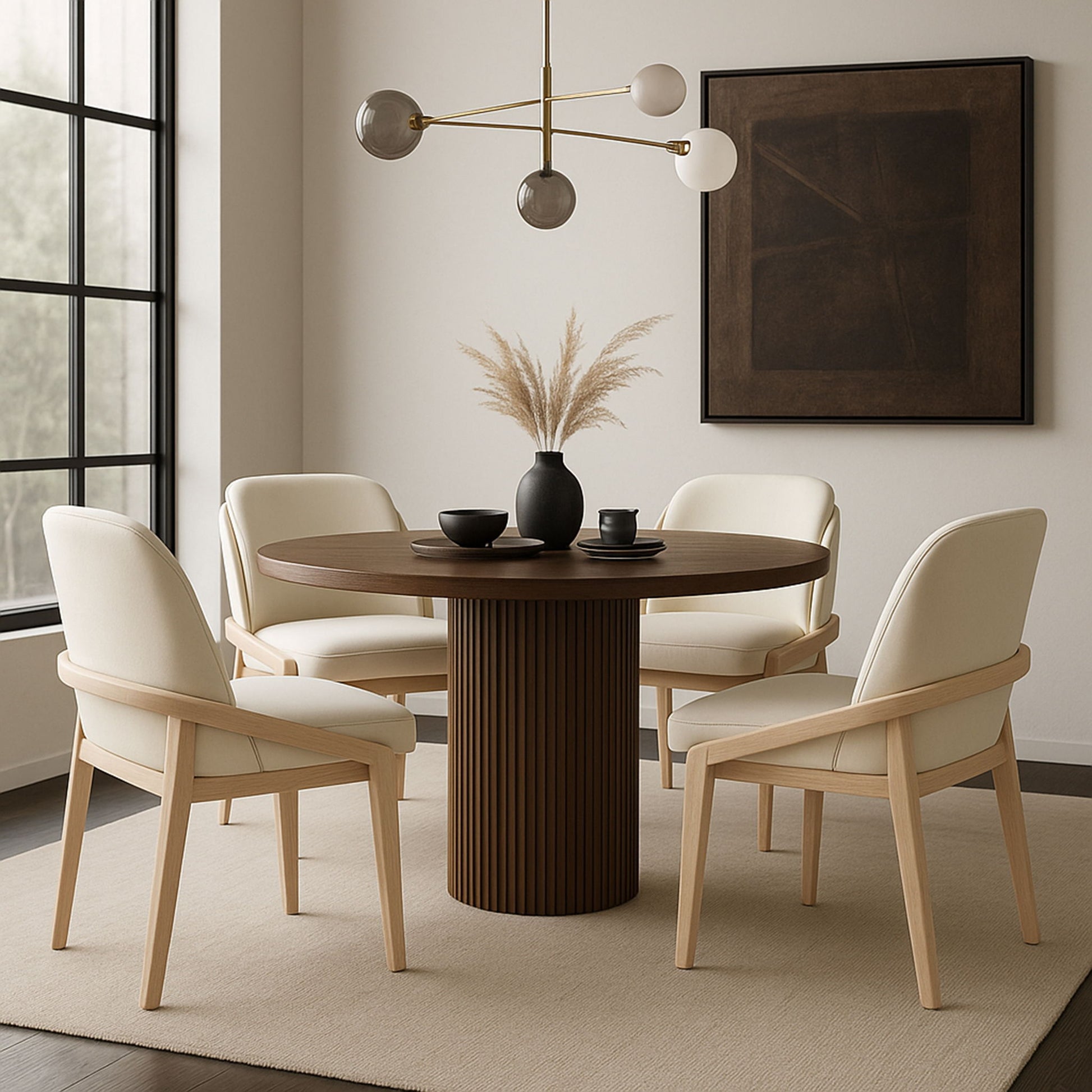 Warm and inviting, the Navo vegan leather upholstered dining chair blends Art Deco elegance with everyday comfort. Its smooth vegan leather seat is paired with a solid wood frame in a rich natural finish for timeless appeal. With its sculpted back and tailored lines, it adds sophistication to any dining setting.