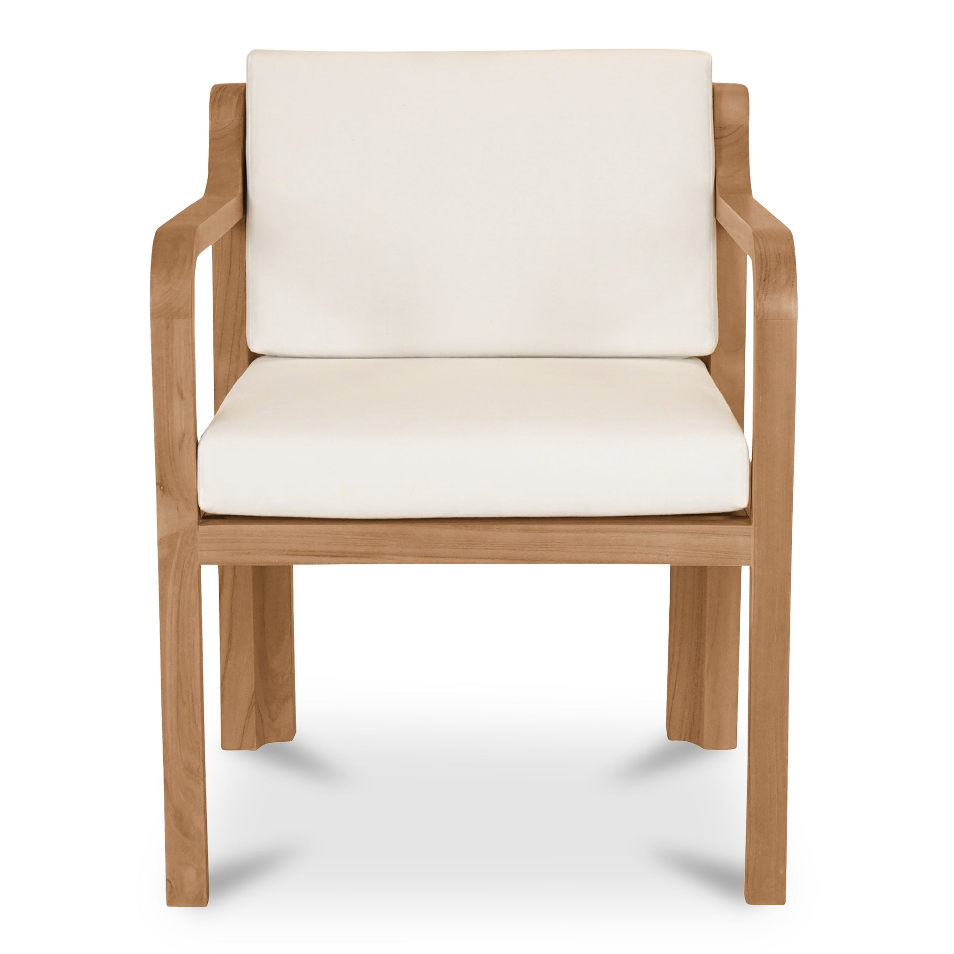 The Nellie outdoor dining chair elevates outdoor dining with comfort and enduring style. This foundational piece features a solid teak frame with quick-dry foam cushions upholstered in white 100% Olefin fabric. The curved back with gradually sloping arms creates a welcoming silhouette whose form is durable and weather resistant.