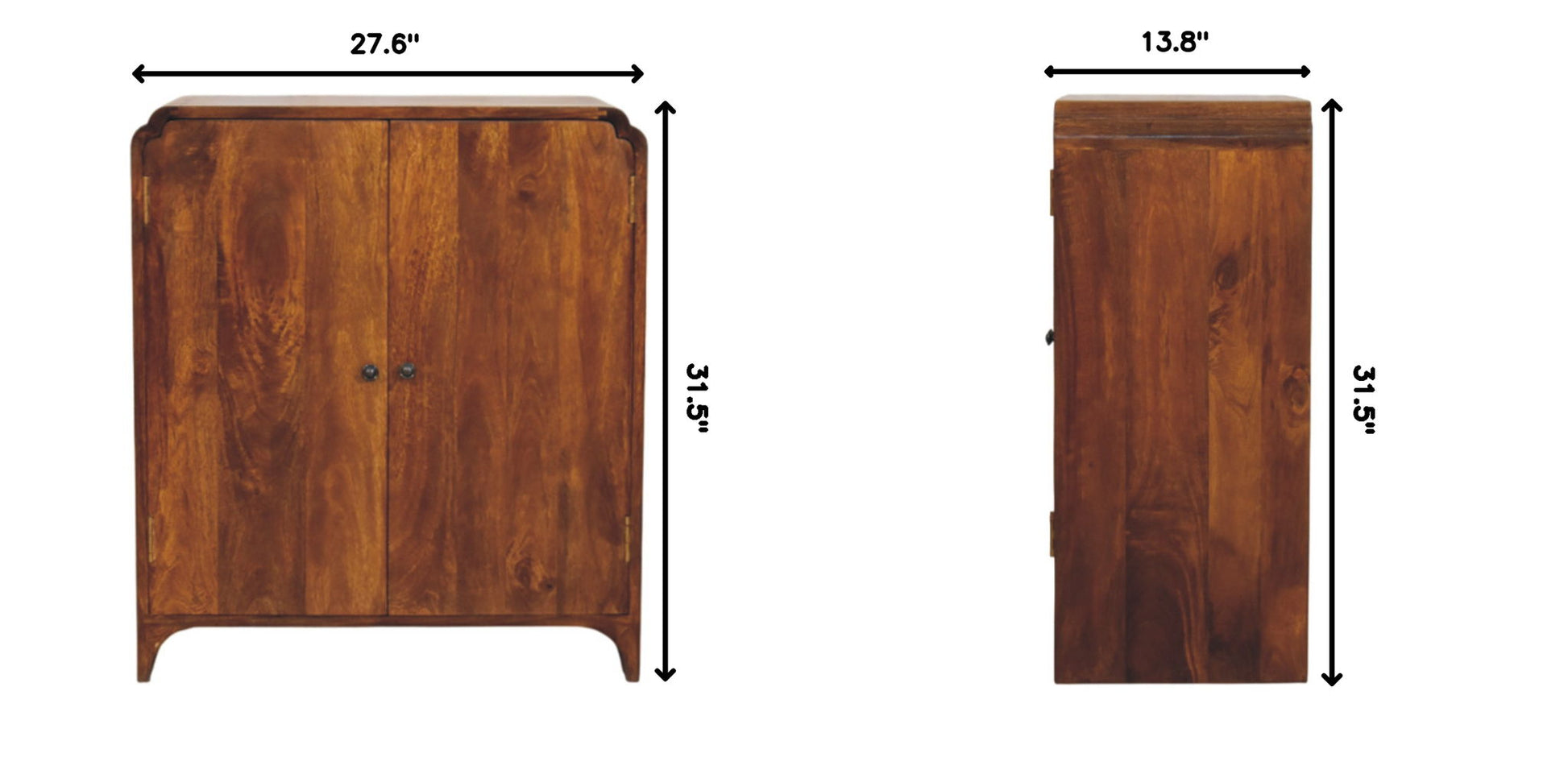 - Newton Chestnut Cabinet - Blending vintage elegance with practical storage, this cabinet is handcrafted from 100% Solid Mango Wood in a rich chestnut finish. Its gracefully curved design adds a refined touch, while the double-door storage, adorned with royal brass knobs, opens to reveal ample shelving for organizing essentials while maintaining a clean and sophisticated aesthetic. Perfect for living rooms, hallways, or bedrooms, this sustainably crafted piece combines timeless craftsmanship with everyday functionality, making it a charming and durable addition to your home.