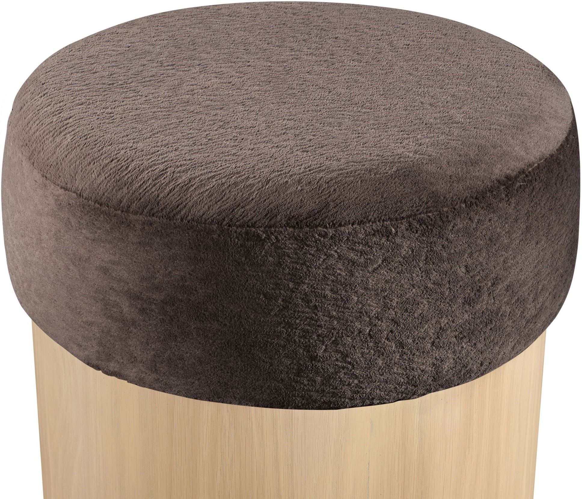 Strikingly modern, the Nimes velour fur fabric upholstered ottoman combines plush comfort with sleek design. The top is wrapped in luxurious velour fur fabric, offering a soft and inviting texture, while the cylindrical rich natural wooden base provides a minimalist contrast. This versatile ottoman is perfect as extra seating, a footrest, or a stylish accent in any living space.