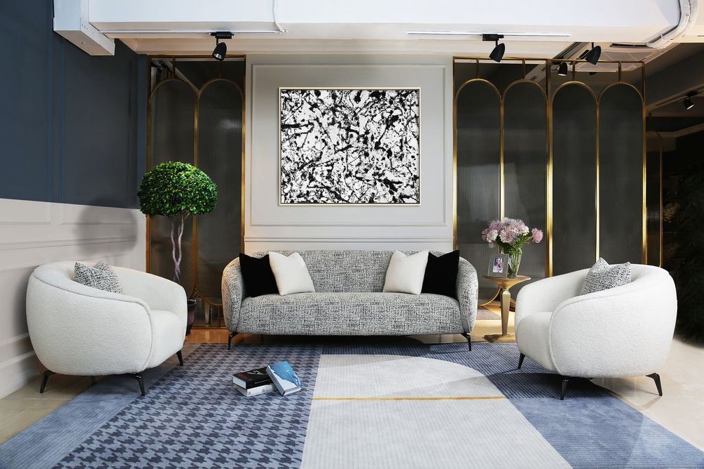 - Upholstered in a recycled polyester Bouclé fabric that is right on trend