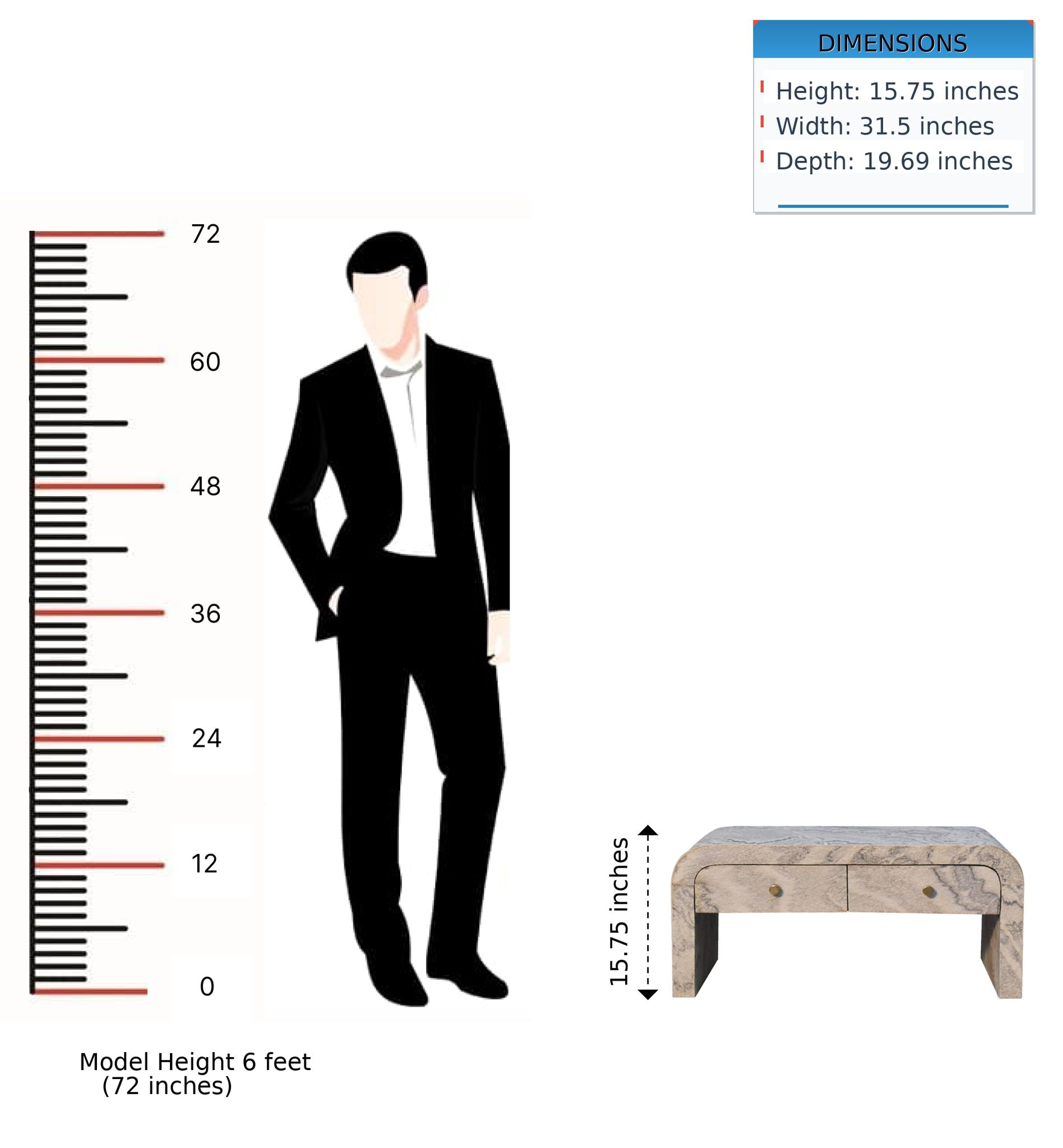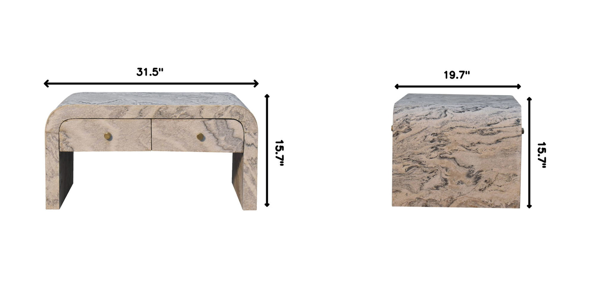 - Nouveau Coffee Table - Introducing the "Nouveau" Coffee Table, a symbol of refined luxury. Crafted from Solid Mango wood with an oak-ish finish inside the drawers, the body features a laminated marble effect stone veneer. Adorned with a shiny brass round knob, and 2 drawers, this coffee table exudes opulence and sophistication, making it a timeless addition to any upscale living room.
