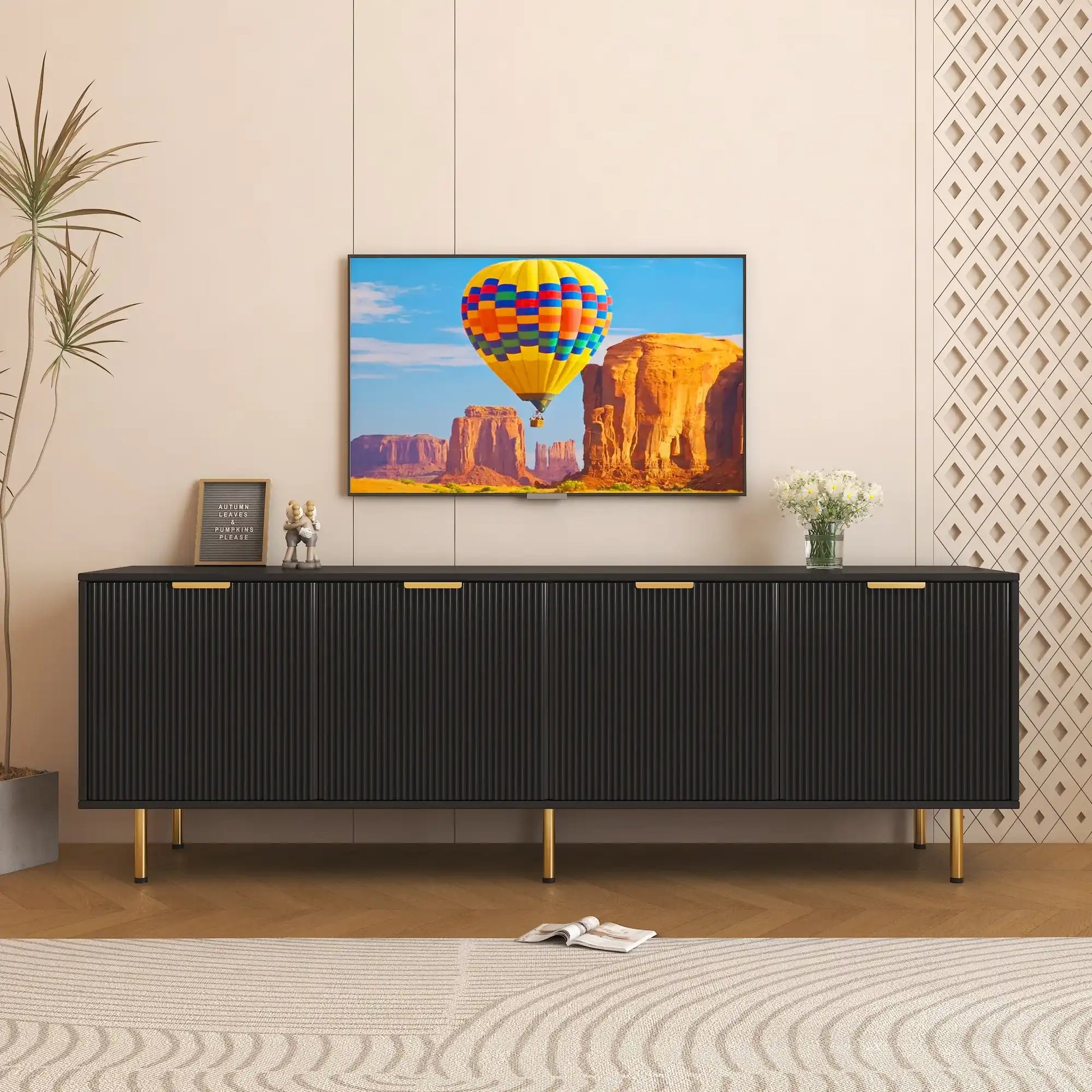 Upgrade your living room or bedroom with the NovaForm Modern Black TV Stand, designed to accommodate TVs up to 79 inches. This sleek and contemporary TV cabinet features a durable MDF construction and a sophisticated black finish, making it the perfect centerpiece for any modern home. Its spacious top surface and elegant design allow you to display decorative items, while seamlessly blending with your existing décor.