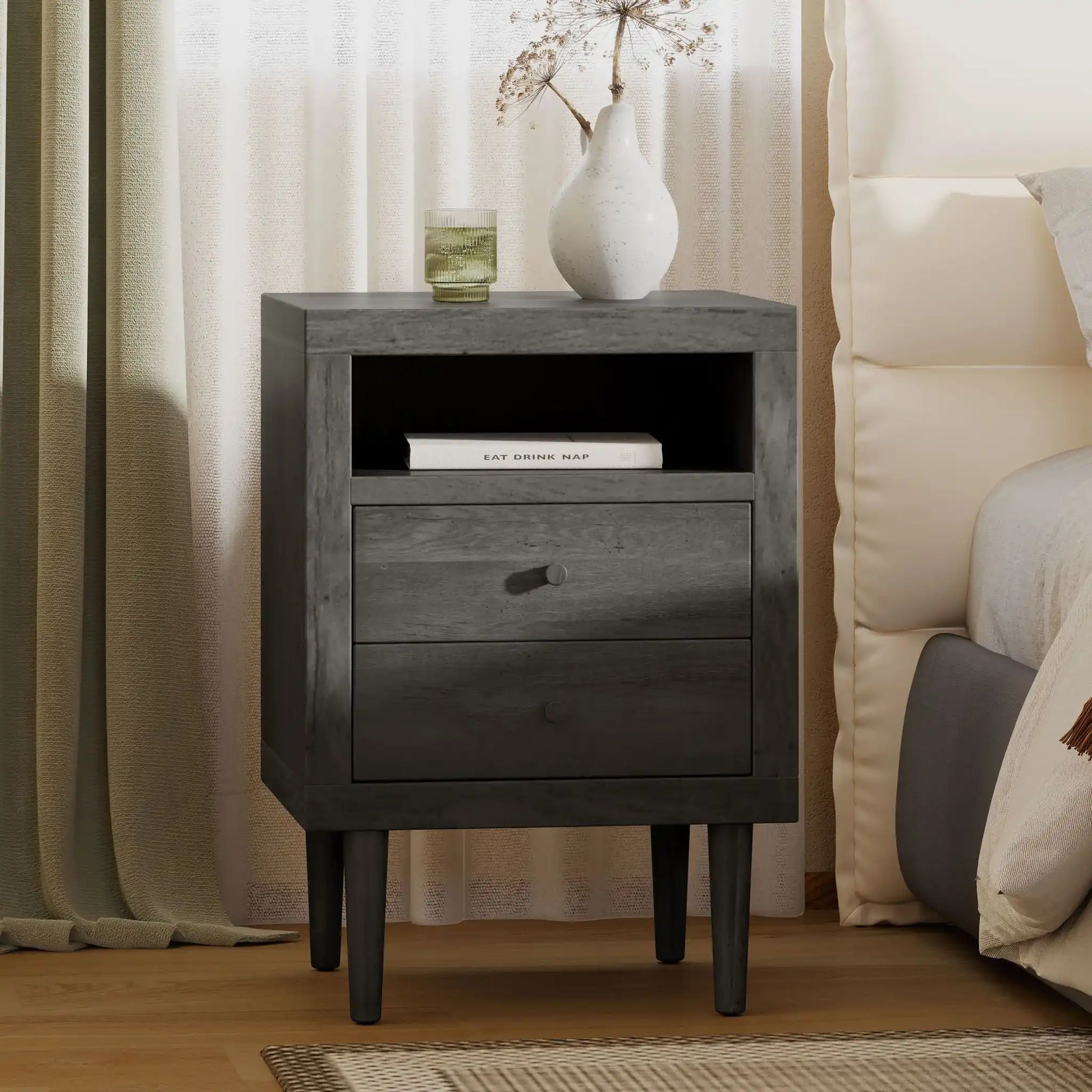 - Mid-Century Design: This nightstand set blends iconic splayed legs with a wood-like frame, offering a stylish mid-century aesthetic for your bedroom.