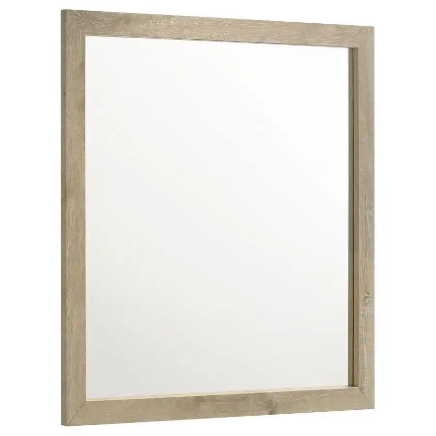 This rectangular mirror enhances bedroom depth and brightness with its sturdy weathered oak frame. Constructed from engineered wood and a scratch-resistant veneer, it offers both durability and rustic charm. Its warm, natural tones complement transitional and rustic designs, making it an excellent standalone piece or the perfect pairing for a matching dresser. Designed to reflect light and create an inviting atmosphere, it elevates your space with timeless style and lasting quality.
