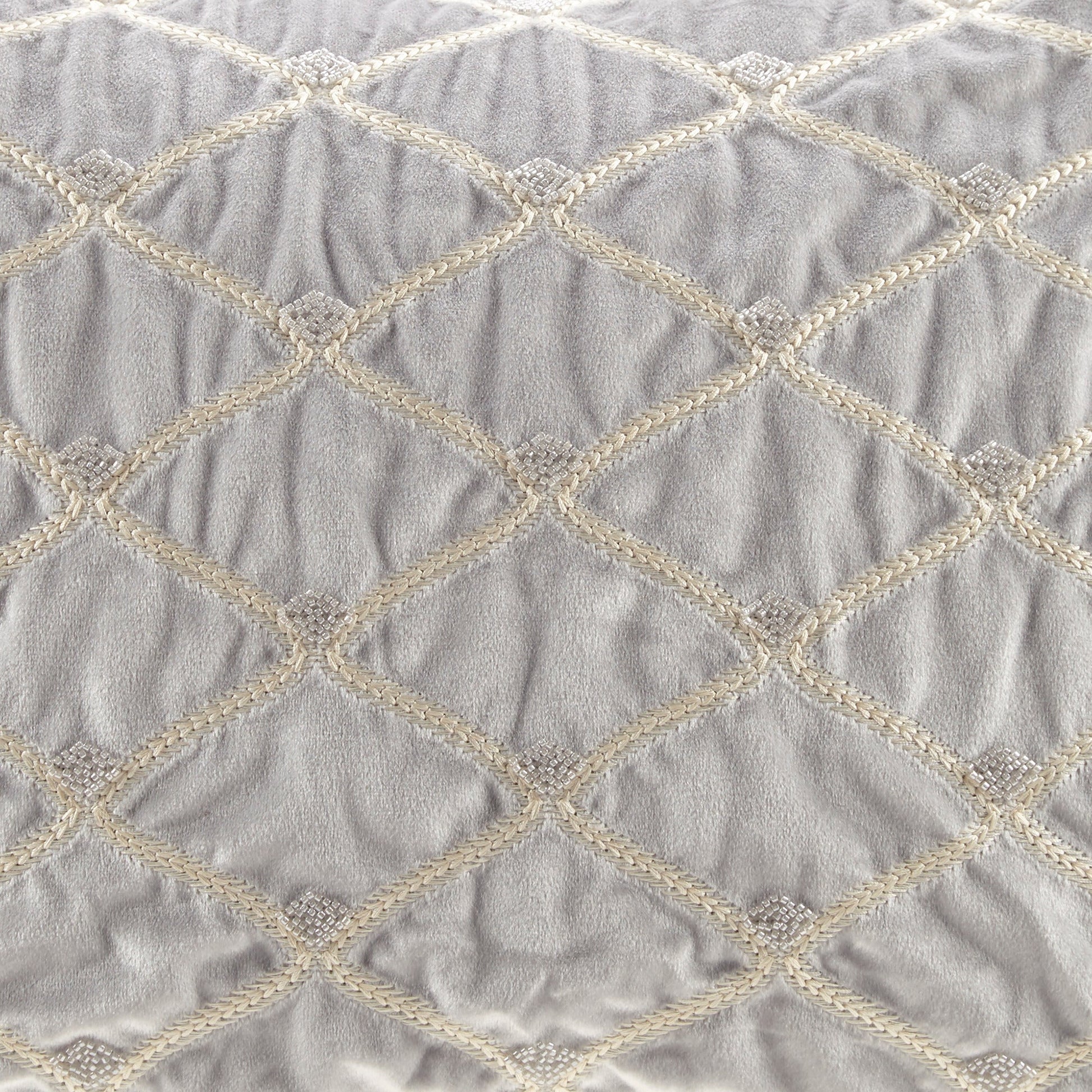 This silver oblong decor pillow combines elegant velvet with detailed hand-beaded embellishments, making it a stylish accent for living rooms, bedrooms, or seating areas. Its plush goose feather insert offers comfort and refined aesthetic appeal.