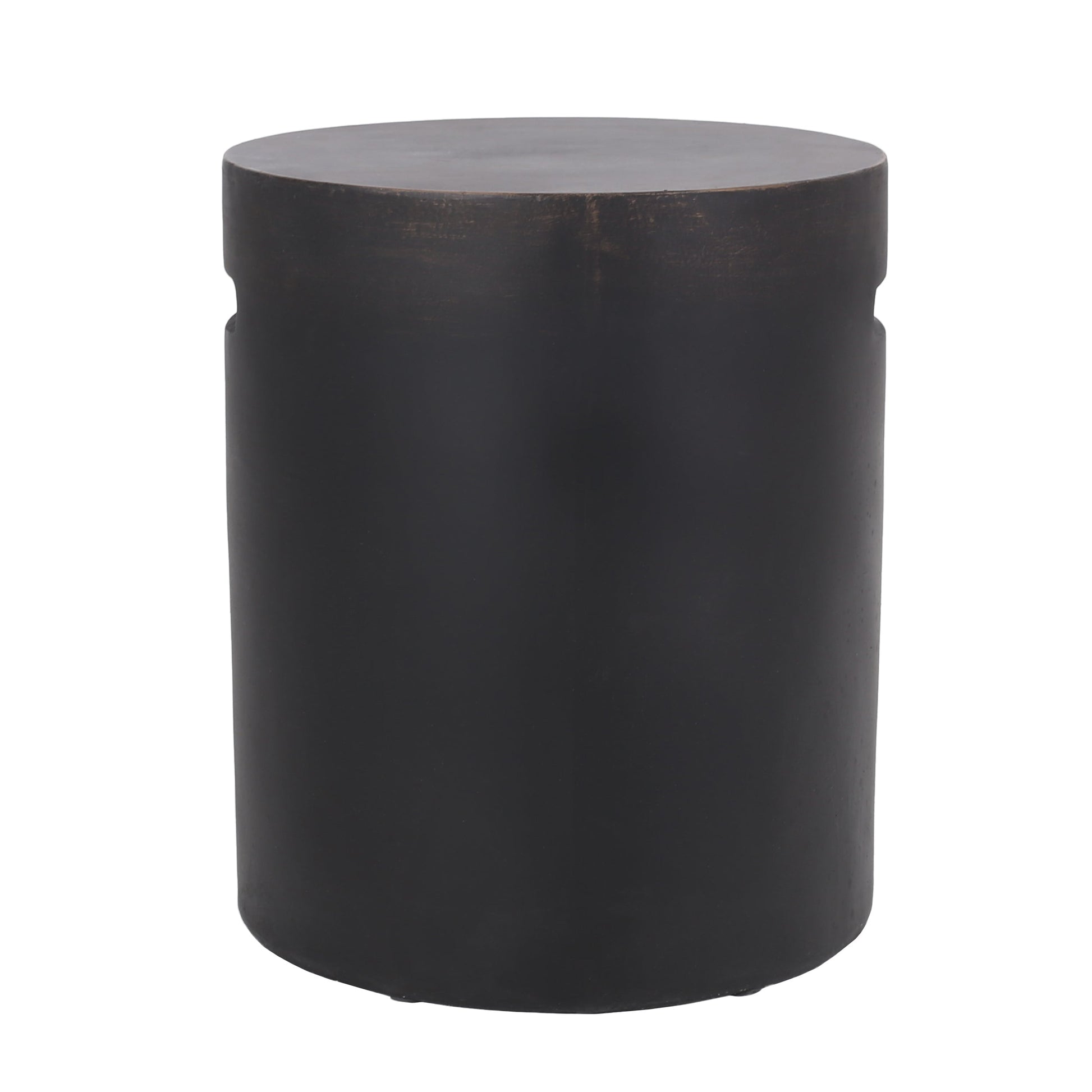 This outdoor end table features a sleek cylindrical design with a convenient cutout handle, perfect for patios or garden seating areas. Its modern aesthetic blends functionality with subtle style to enhance any outdoor space.