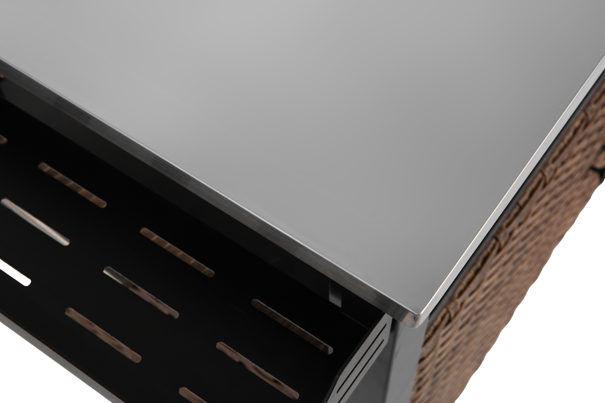 This large outdoor wicker island rolling cart is designed for garden and patio use, offering ample storage and functional features to enhance your outdoor kitchen setup.