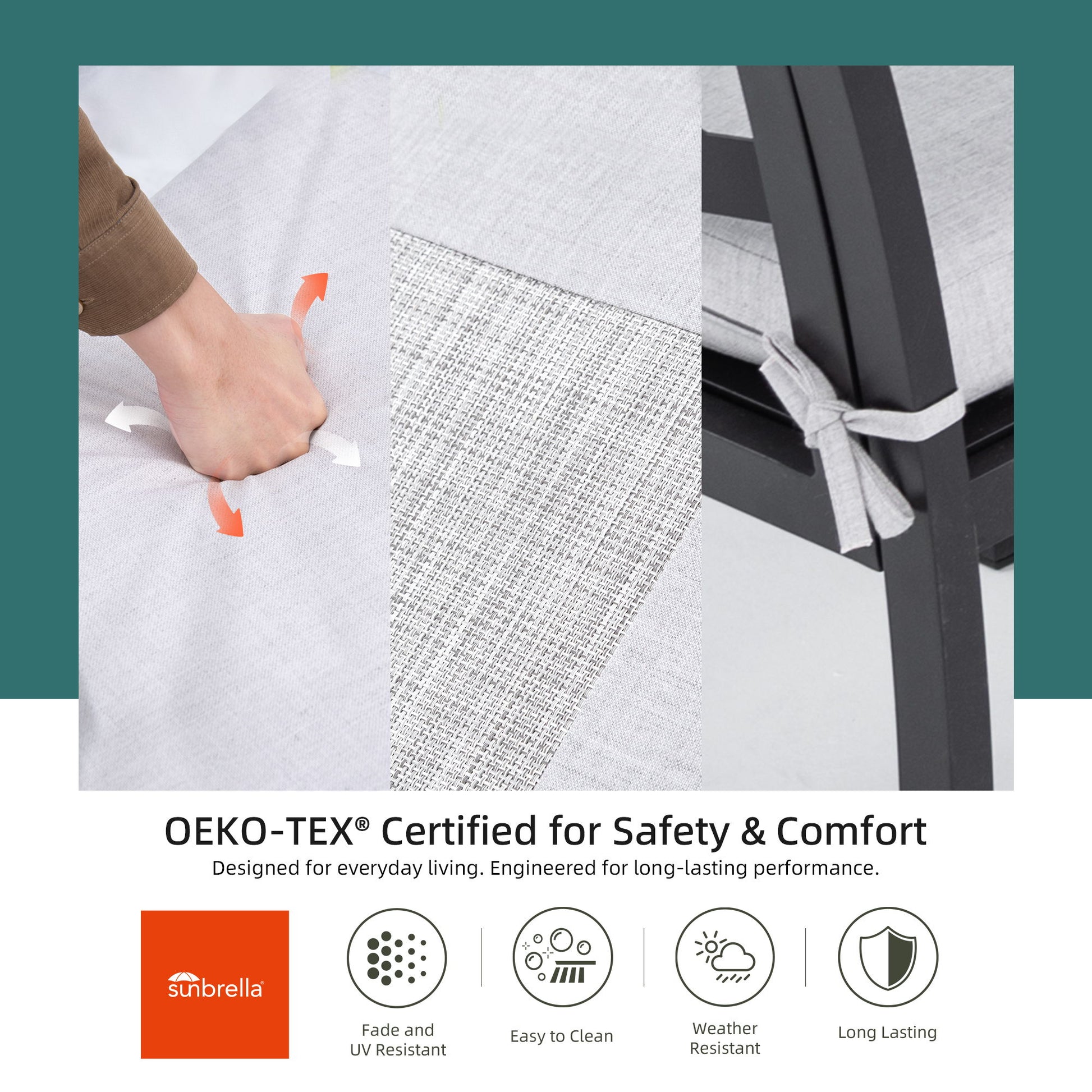- Sunbrella Cushions: Cushions are made with premium Sunbrella fabric in Cast Silver, offering superior fade, stain, and weather resistance with zippered, removable covers and high-density foam for lasting comfort.