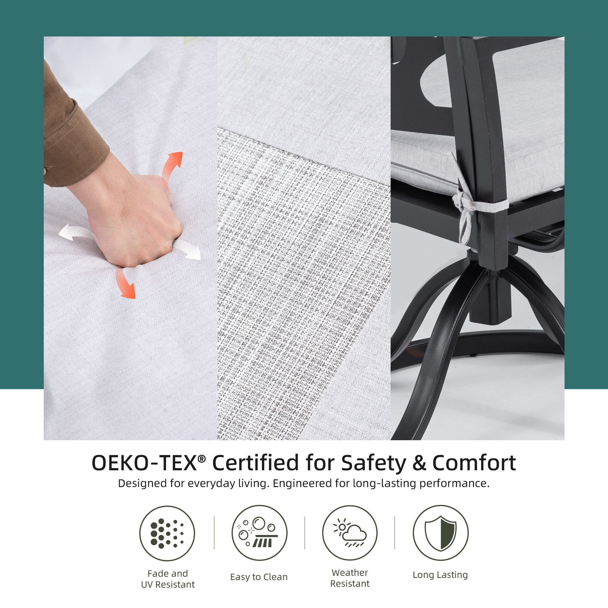 - Sunbrella Cushions: Cushions are made with premium Sunbrella fabric in Cast Silver, offering superior fade, stain, and weather resistance with zippered, removable covers and high-density foam for lasting comfort.
