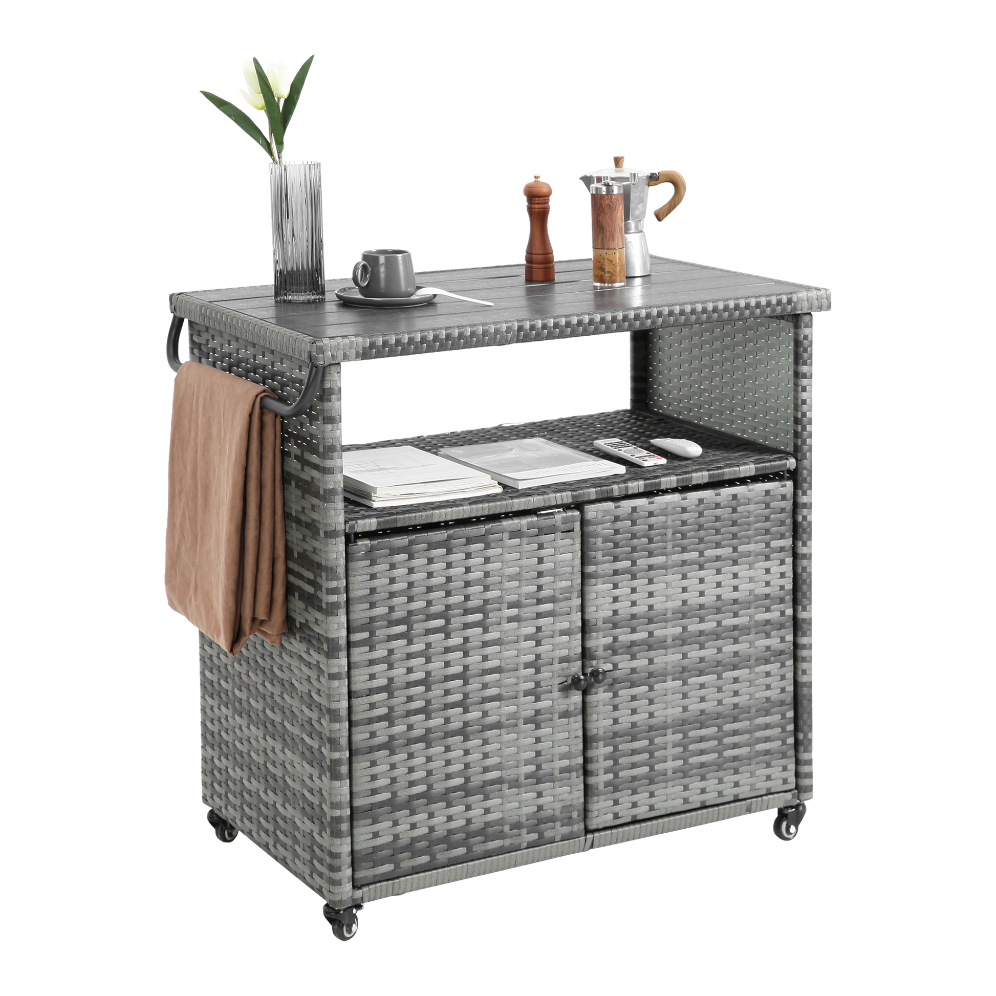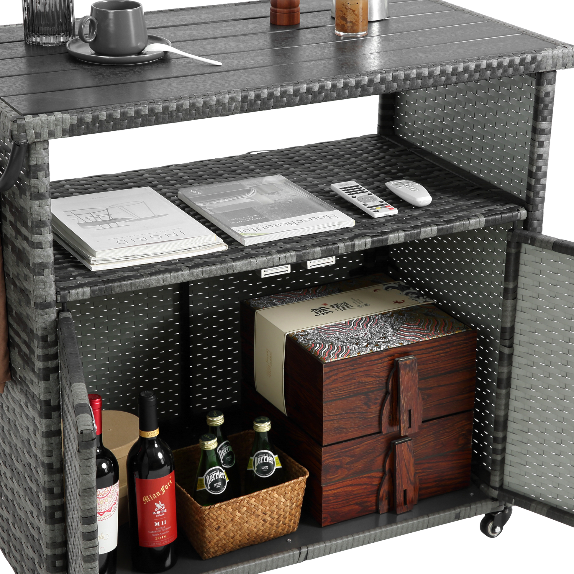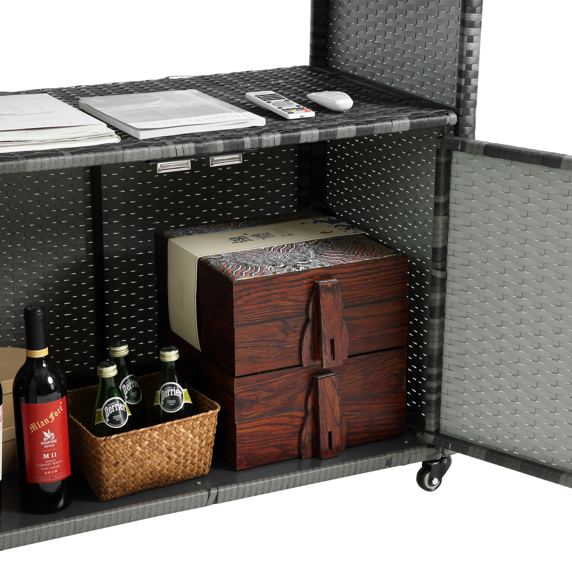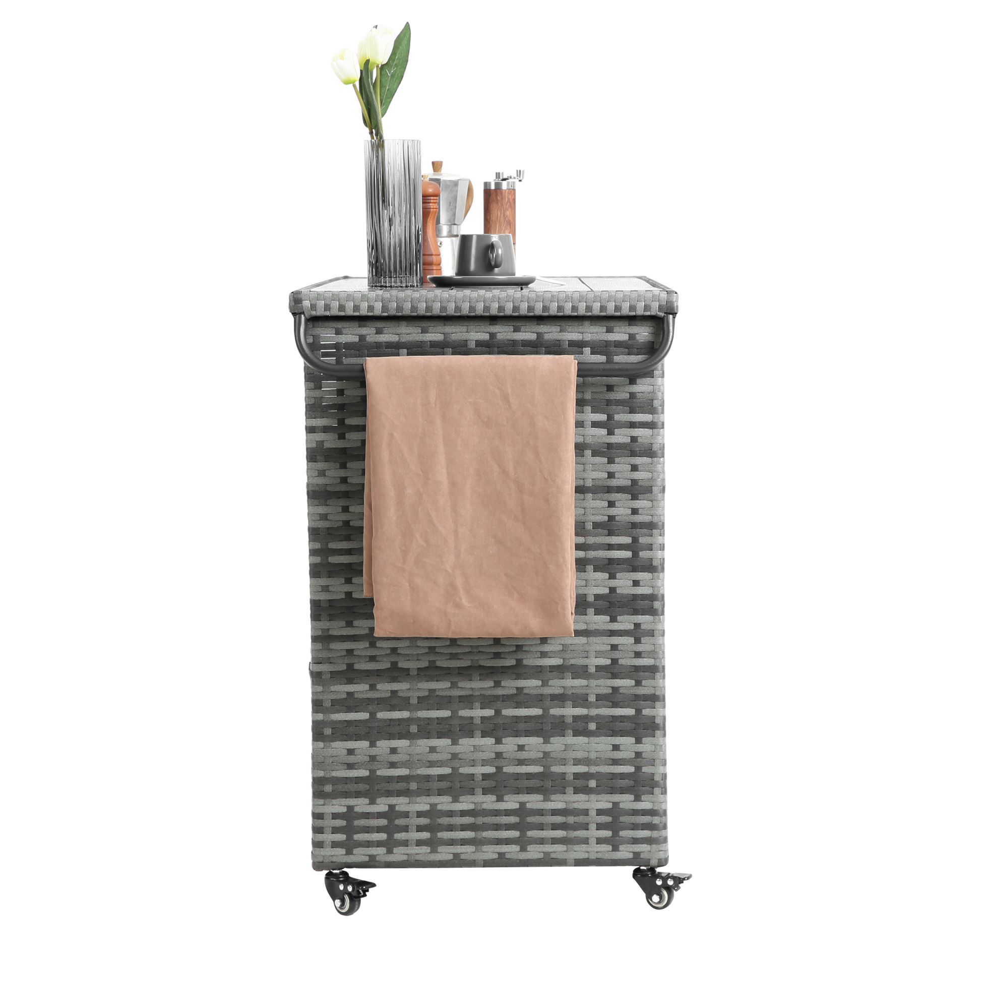 This outdoor wicker bar cart is designed for convenient beverage serving and storage. Perfect for patios, backyard gardens, and poolside parties, it combines functionality with a stylish rattan aesthetic.
