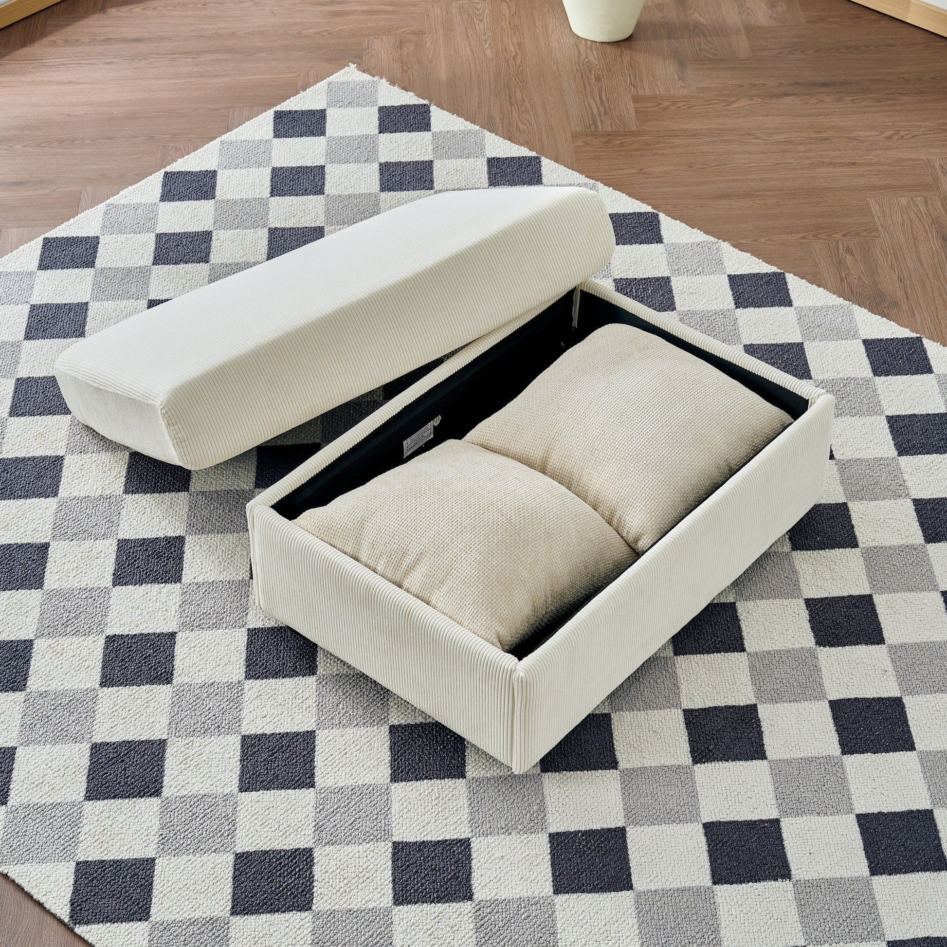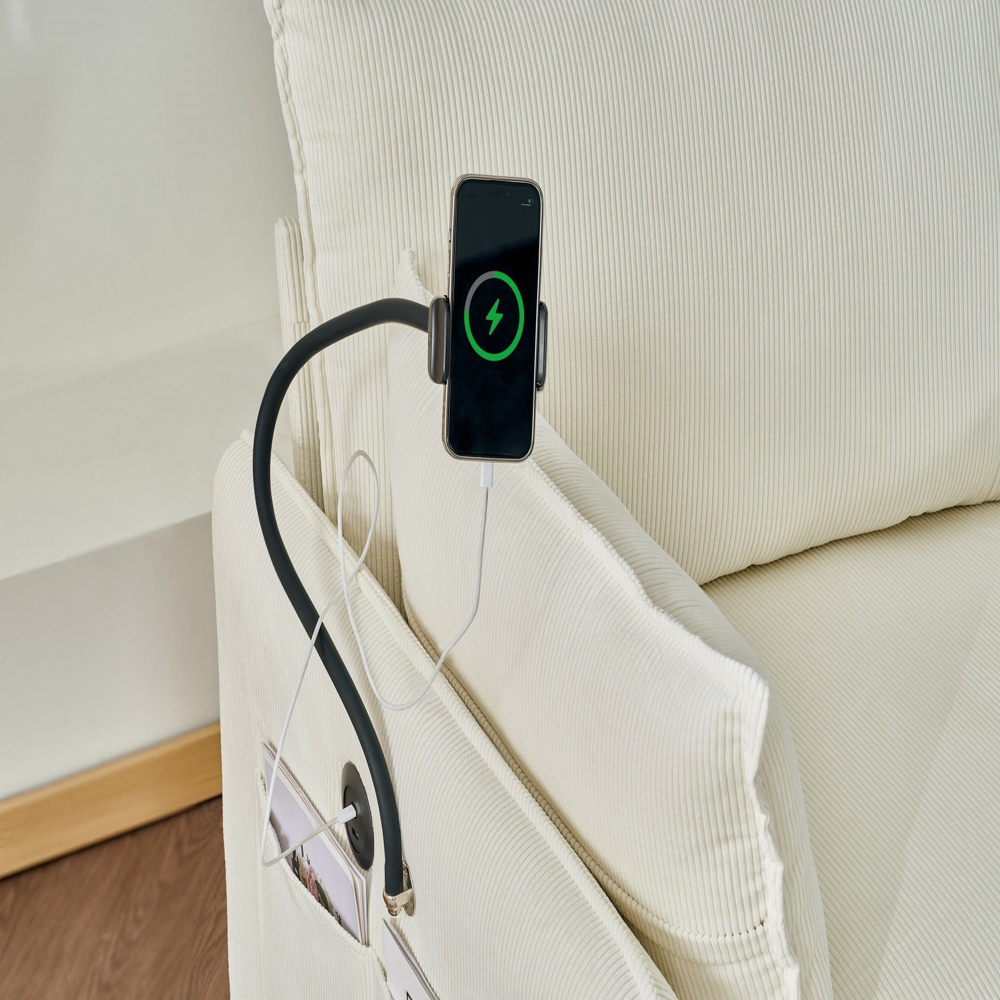 This oversized chaise lounge chair with ottoman is ideal for living rooms or lounging areas. Designed for comfort and convenience, it combines stylish beige corduroy with practical storage and device charging features.