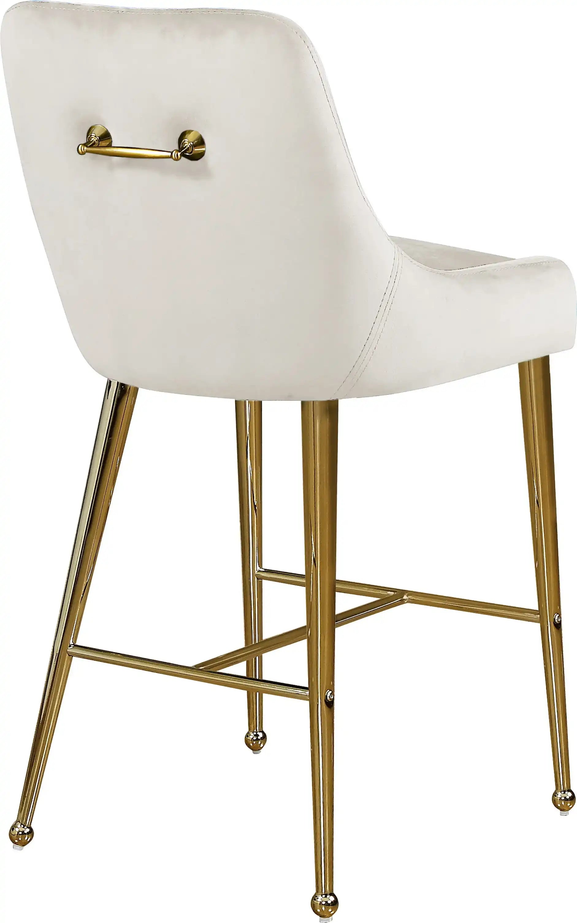 The home bar or kitchen counter gets a contemporary makeover with the addition of this Owen Cream Velvet Stool. Clean lines and a simple design make this stool nothing short of elegant. The cream velvet upholstery is sleek and svelte to the touch, revving up the comfort factor of this stunning stool. The polished gold legs have a ball design that's both modern and sophisticated, while a matching handle on the back adds to the overall modish feel of this delightful stool.
