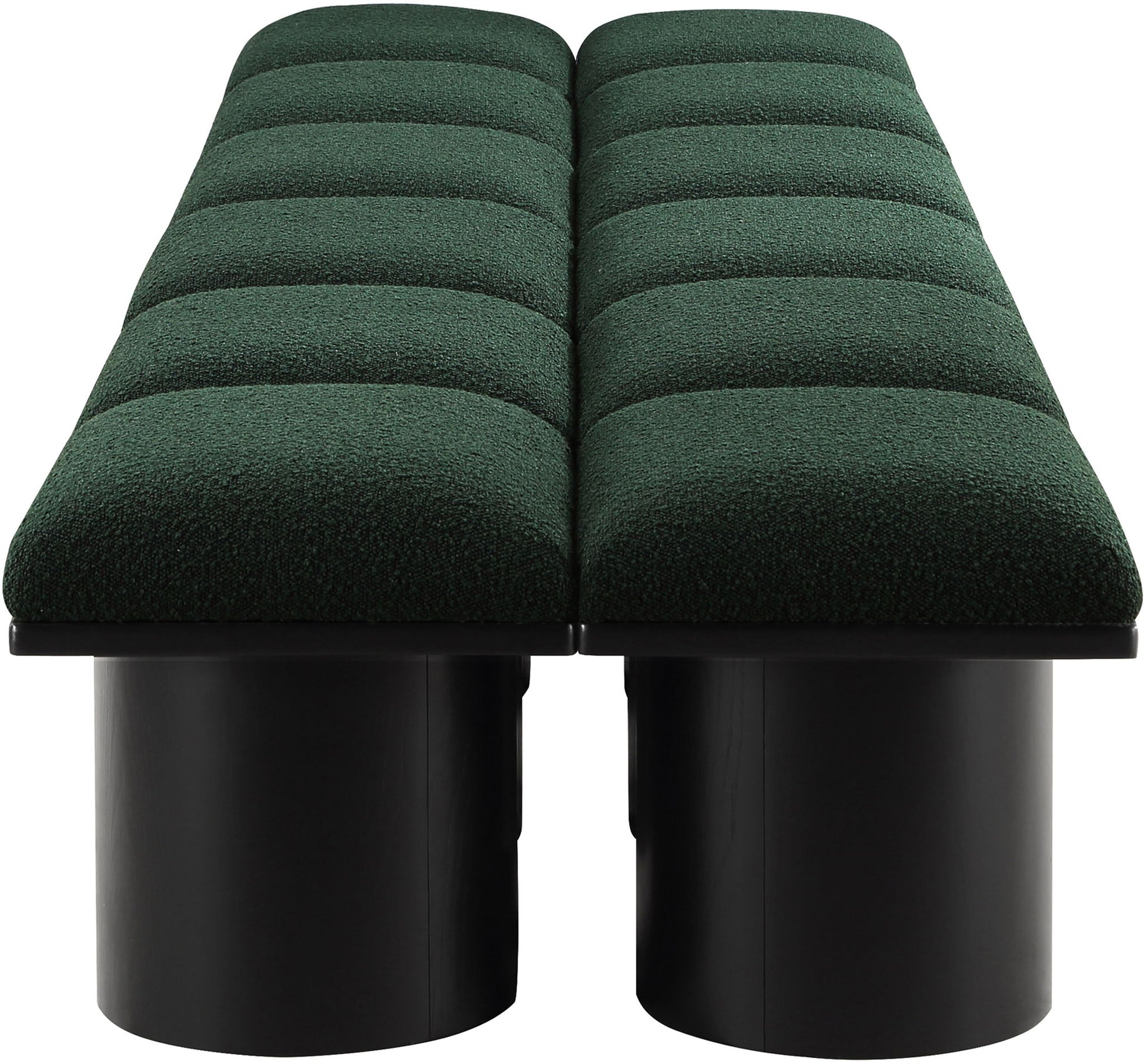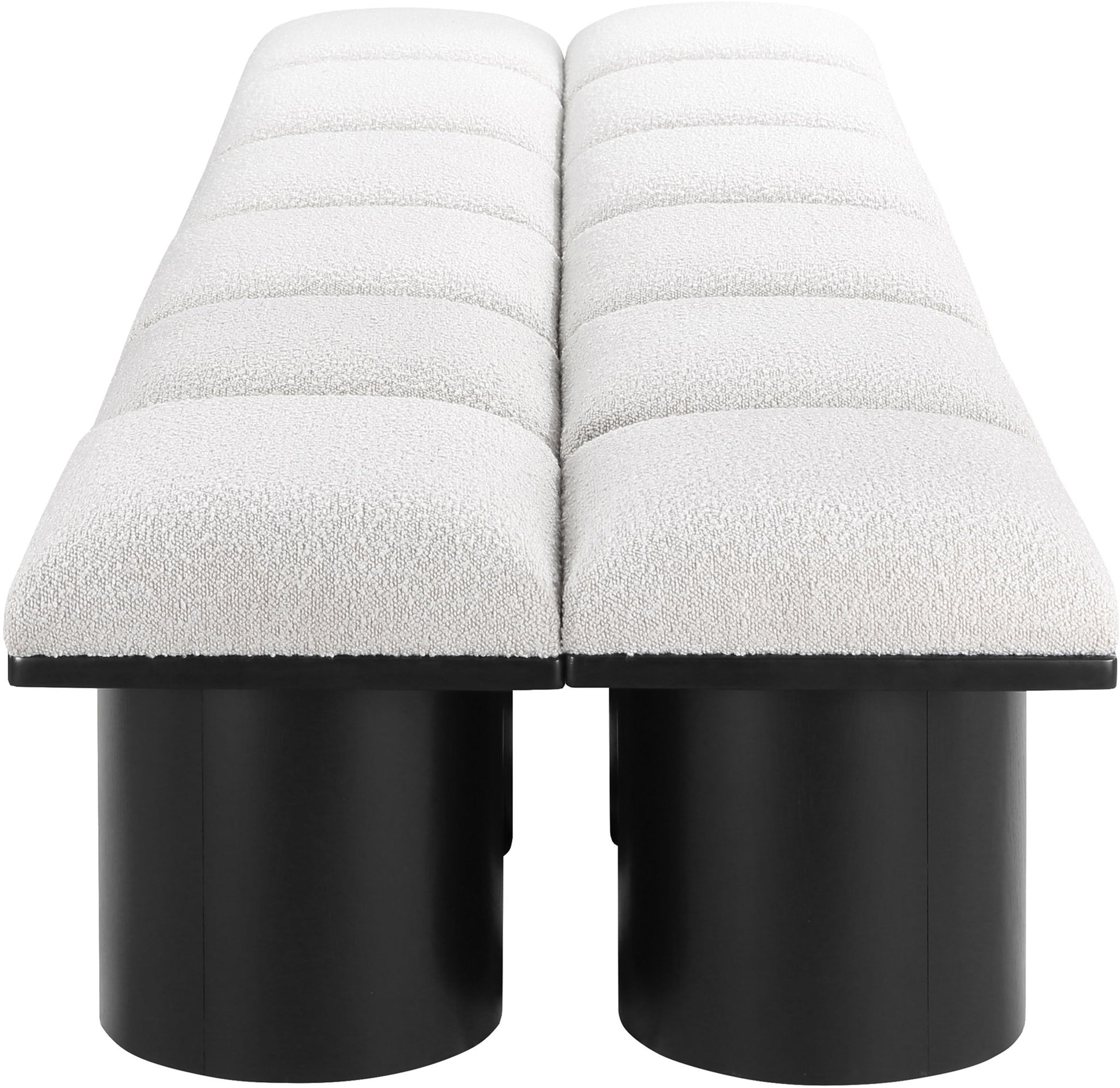 Bring valuable seating and remarkable style to your space with this Pavilion Boucle Fabric Bench, an exquisite balance of style and usability for the entryway, bedroom, and beyond. Crafted from oak veneer with a black finish, this bench has a 4-inch-thick seat cushion that's channel-tufted for a touch of luxury. The bench's columnar bases add a dash of Art Deco design, making it a captivating focal point in any room.