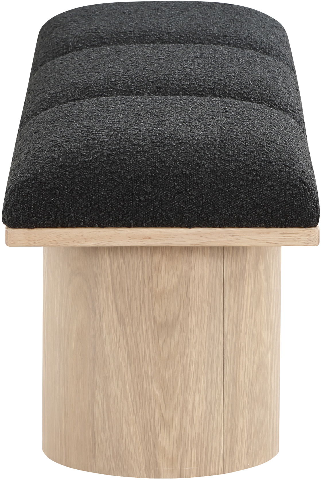 Bring valuable seating and remarkable style to your space with this Pavilion boucle fabric bench, an exquisite balance of style and usability for the entryway, bedroom, and beyond. Crafted from oak veneer with a natural finish, this bench has a 4-inch-thick seat cushion that's channel-tufted for a touch of luxury. The bench's columnar bases add a dash of art deco design, making it a captivating focal point in any room.