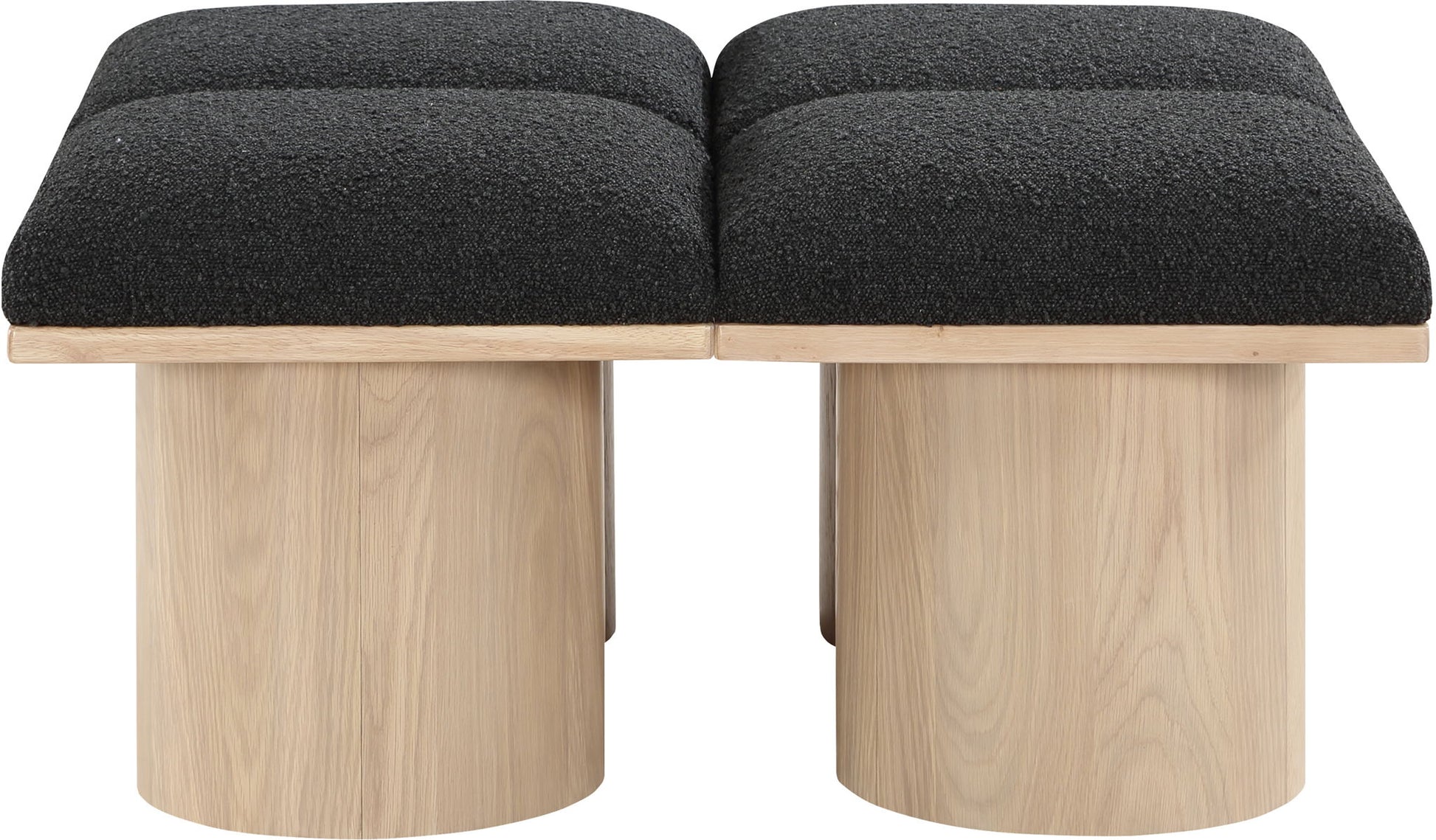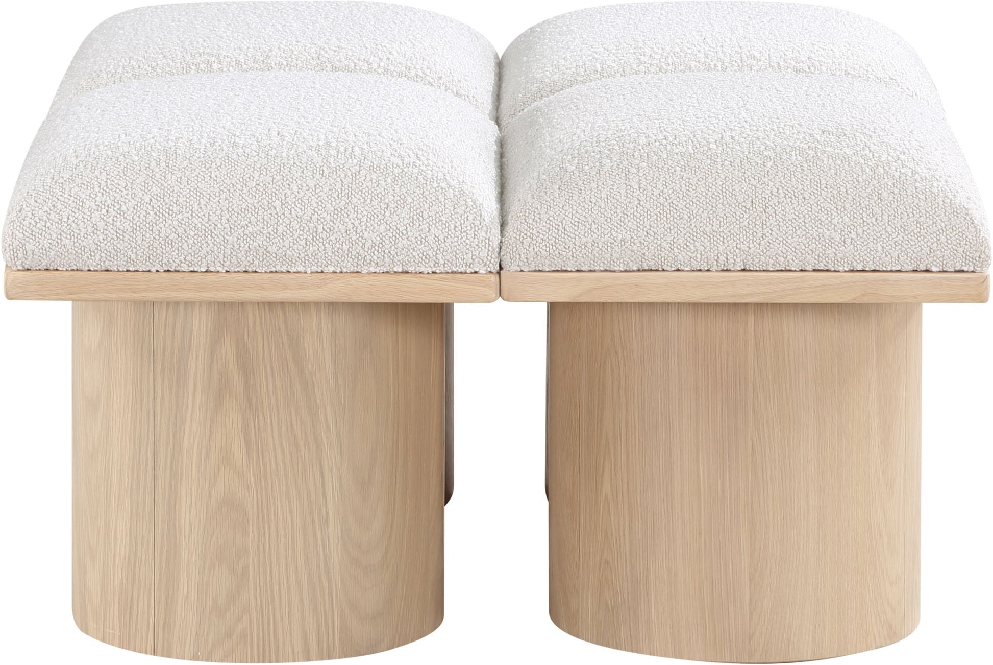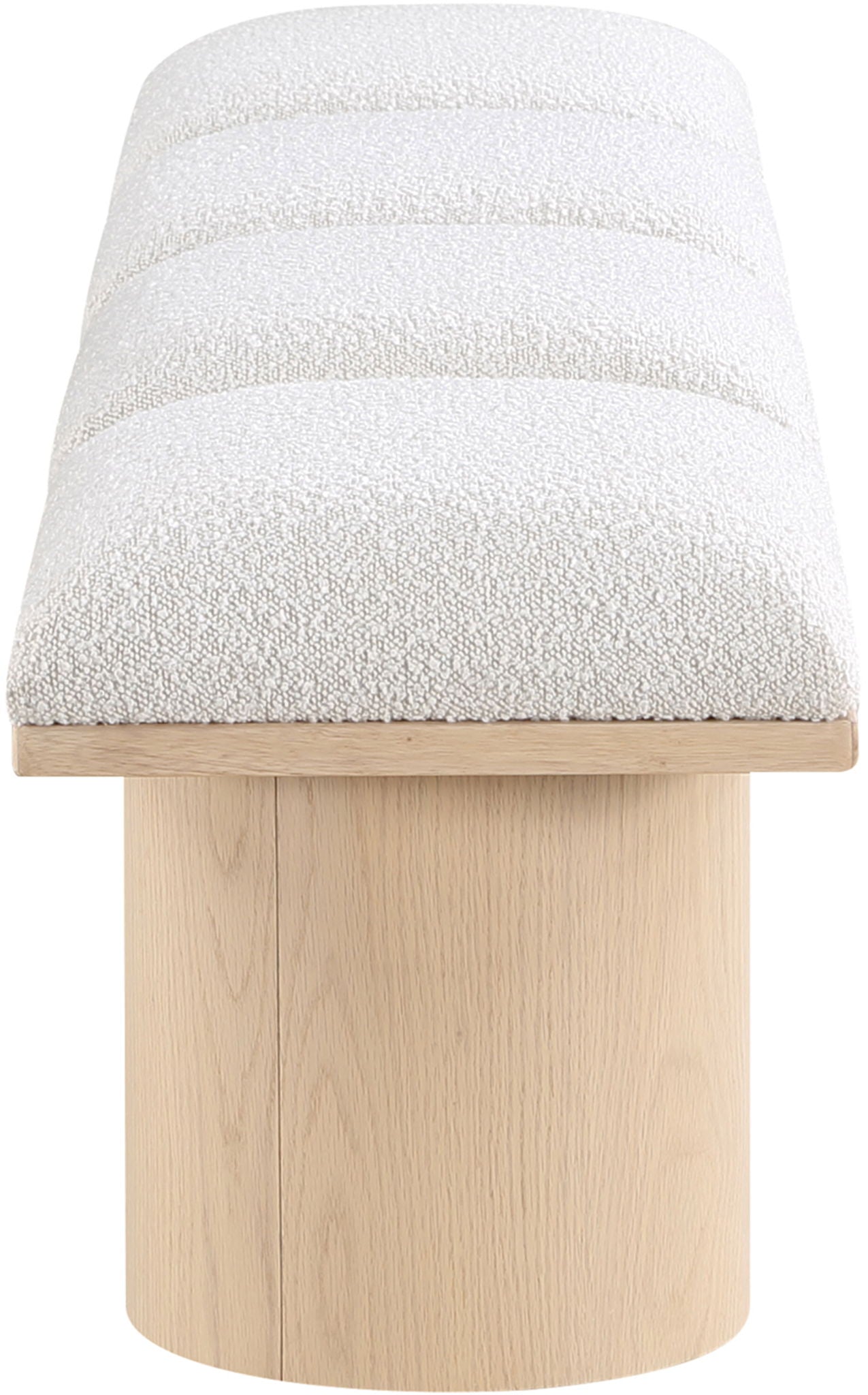 Bring valuable seating and remarkable style to your space with this Pavilion boucle fabric bench, an exquisite balance of style and usability for the entryway, bedroom, and beyond. Crafted from oak veneer with a natural finish, this bench has a 4-inch-thick seat cushion that's channel-tufted for a touch of luxury. The bench's columnar bases add a dash of art deco design, making it a captivating focal point in any room.