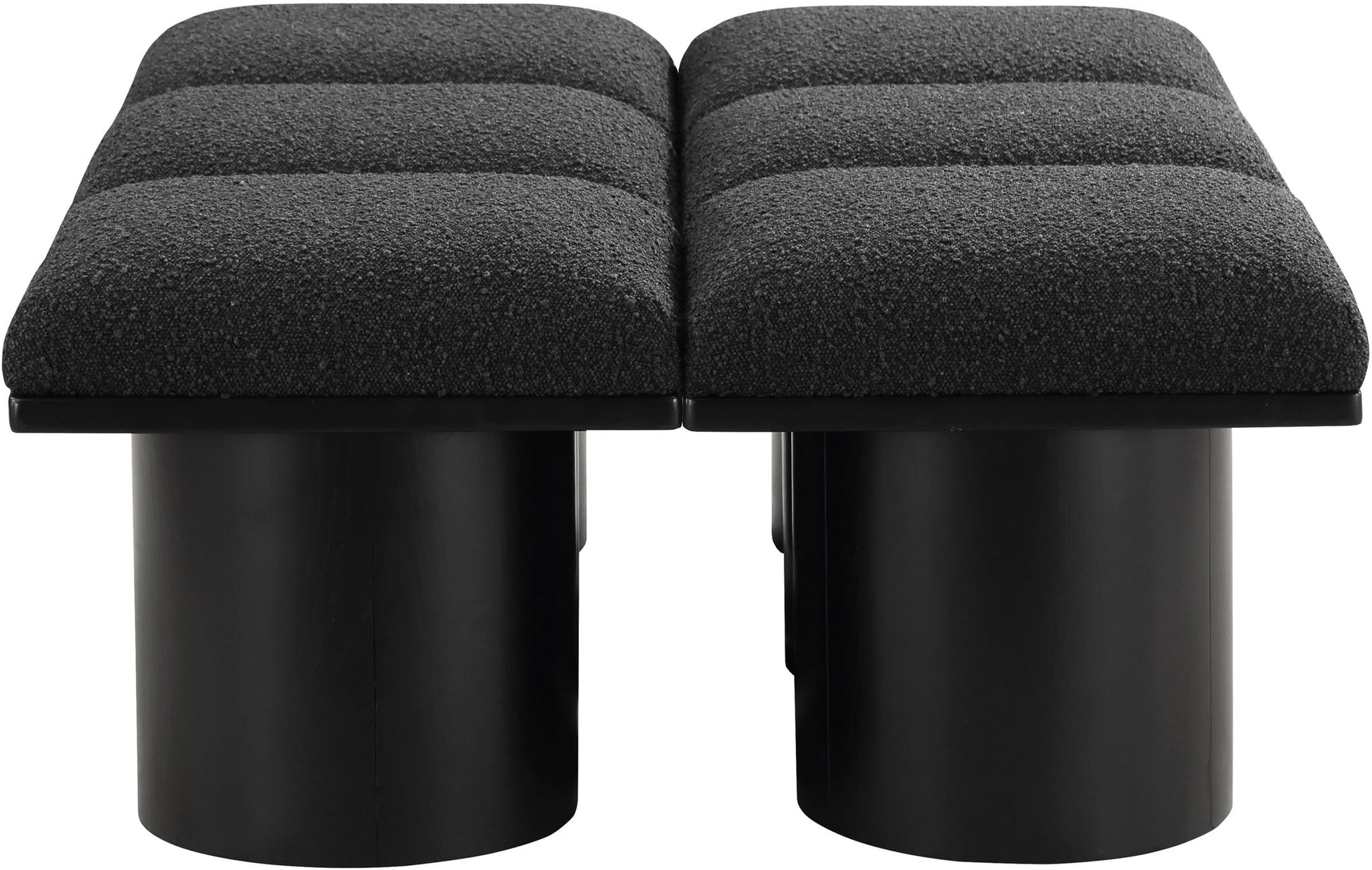 Bring valuable seating and remarkable style to your space with this Pavilion Boucle Fabric Bench, an exquisite balance of style and usability for the entryway, bedroom, and beyond. Crafted from oak veneer with a black finish, this bench has a 4-inch-thick seat cushion that's channel-tufted for a touch of luxury. The bench's columnar bases add a dash of Art Deco design, making it a captivating focal point in any room.