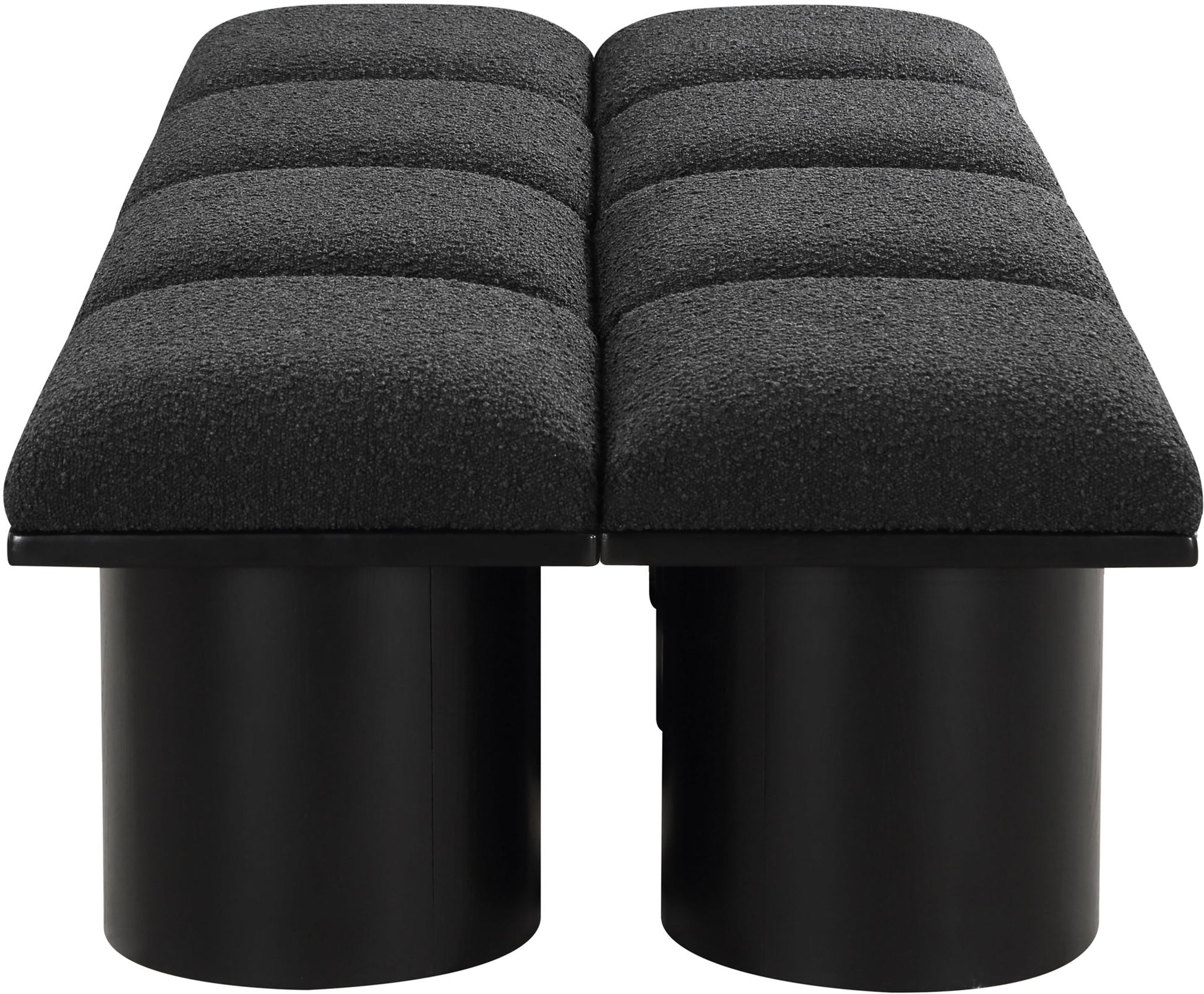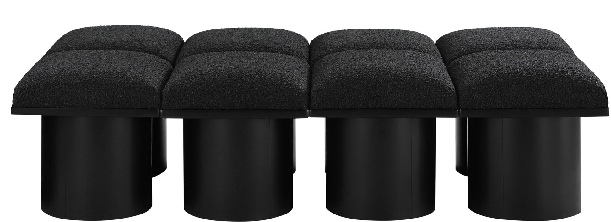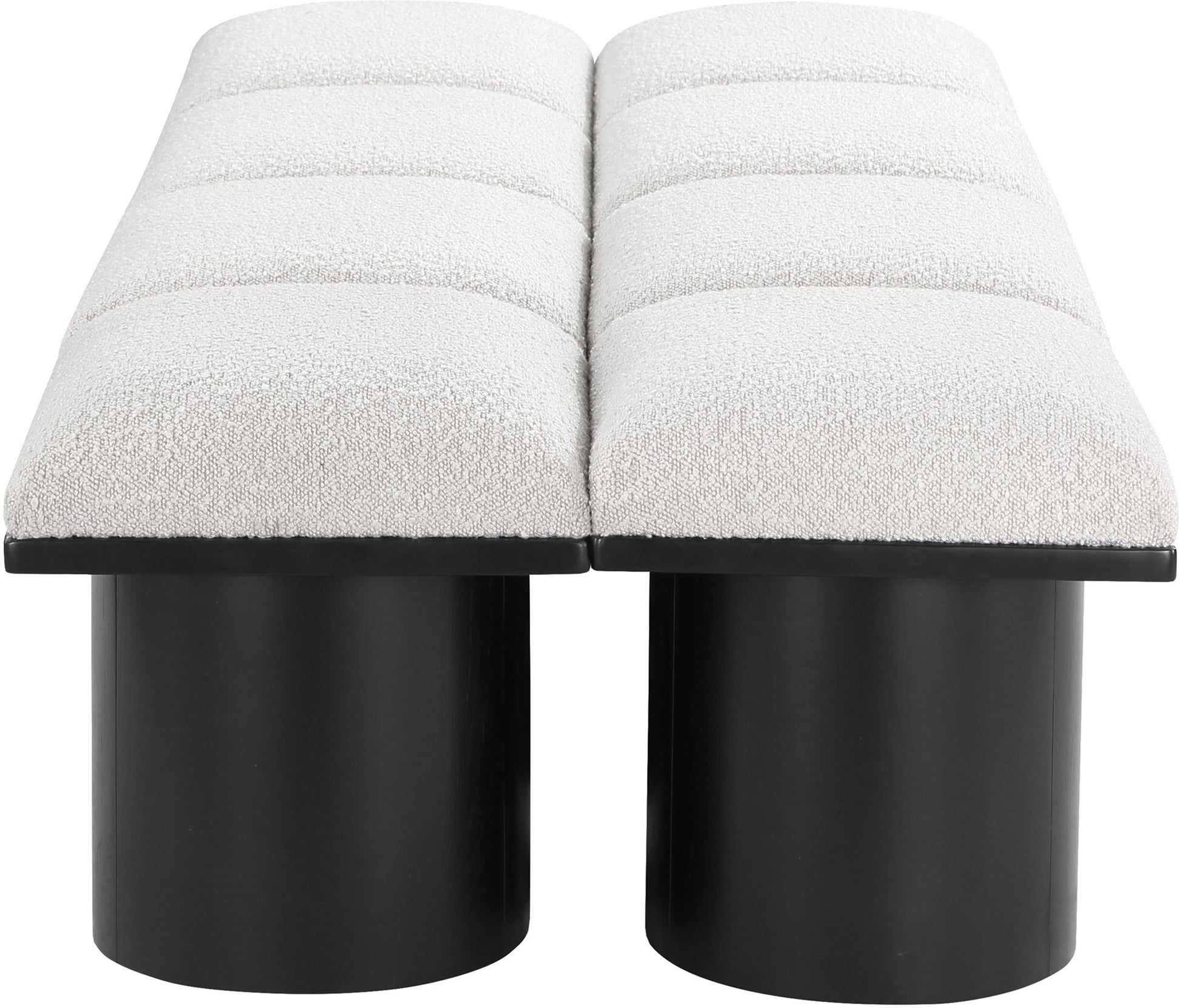 Bring valuable seating and remarkable style to your space with this Pavilion Boucle Fabric Bench, an exquisite balance of style and usability for the entryway, bedroom, and beyond. Crafted from oak veneer with a black finish, this bench has a 4-inch-thick seat cushion that's channel-tufted for a touch of luxury. The bench's columnar bases add a dash of Art Deco design, making it a captivating focal point in any room.